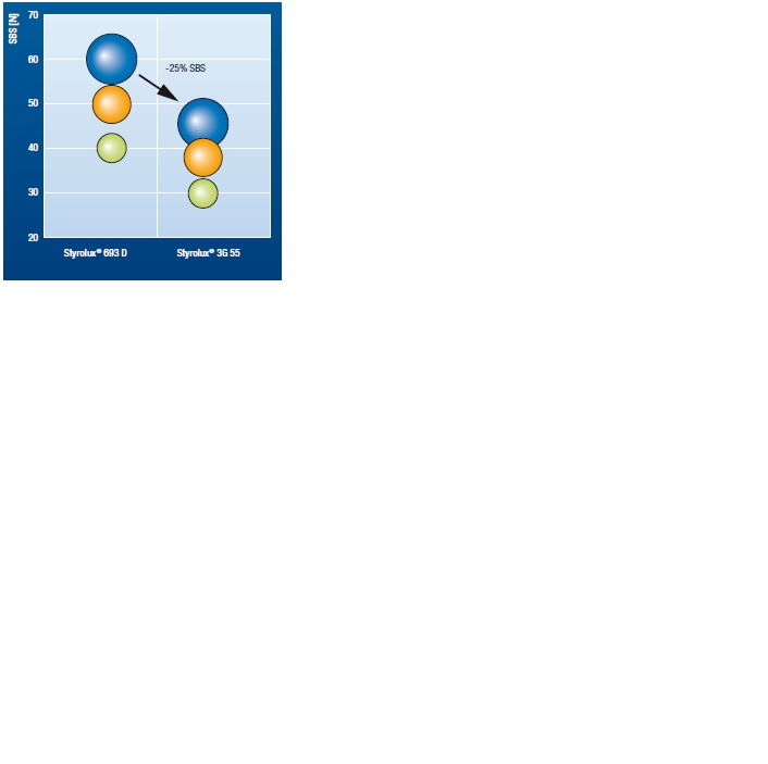 Марки ПС, не содержащие масла , такие как 158N, дают наилучшие значения прозрачности при смешении со Стиролюксом. Хотя прочность повышается при использовании маслосодержащих марок ПС, таких как 124N/L при той же дозировке, прозрачность снижается. Смесь Стиролюкса с 124N/L представляет собой лучшее отношение прочности и прозрачности.