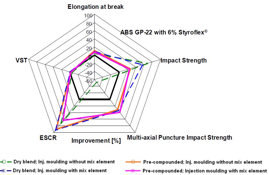 Таким образом, Стирофлекс работает адгезивом между слоями пластиков очень широкого спектра. Кроме задачи совмещения слоев разных полимеров, слой Стирофлекса улучшает свойства получаемой пленки. Благодаря высокому содержанию каучука, Стирофлекс представляет собой весьма эффективный модификатор различных пластиков. Прежде всего речь идет о непрозрачных пластиках стирольной и полиолефиновой группы. О модификации ПЭ упомянуто в предыдущем посте, здесь покажем АБС и ПП. На практике при модификации АБС замещен ряд дополнительных положительных эффектов, например повышение химстойкости и текучести, то есть небольшой дозировкой Стирофлекса получали довольно приличную литьевую марку из средней экструзионной. Ранее самое крупное применение Стирофлекса было внутри БАСФ: он применялся для получения премиальной экструзионной марки АБС, Terluran Nano (теперь не производится, т.к. линия переведена на производство АСА). Справедливости ради стоит отметить, что в России опыты по добавке в АБС Стирофлекса с предварительным компаундированием не дали такого положительного результата, как при добавлении непосредственно в экструдер или ТПА. Меньшую эффективность пред-компаундированных смесей подтверждают и лабораторные результаты. Компаундеры в Европе покупают довольно много Стирофлекса, но скорее всего он применяется для иных задач, чем простая модификация АБСа. Производители компаундов редко нам докладывают о своих ноу-хау, поэтому подробностей я вам тут не сообщу.