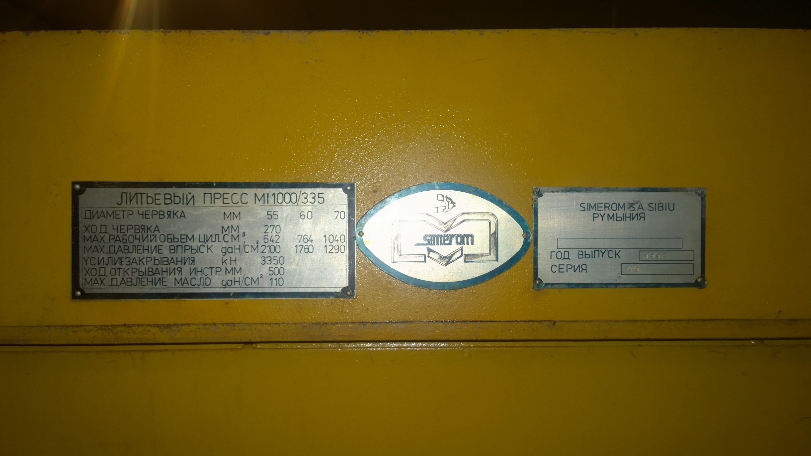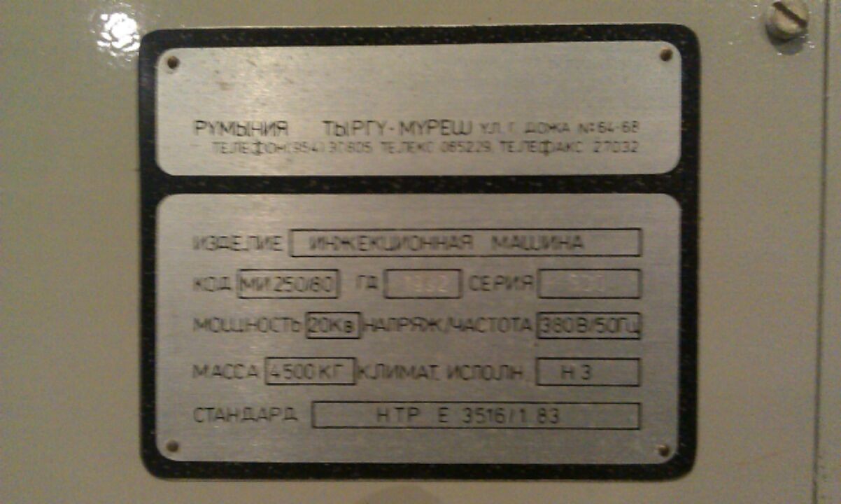 ДА уж! у нас мелочь была по сравнению с этой. Килограмовка- 335 тонн усилие запирания. 90 годов выпуска. А максимальное давление что то маловато 110. Как думаете восстанавливать без документации? Может кто и предложит. Если гидравлика комплектна кроме насосов. Насосы подобрать не проблемма. А электрика? Запас прочности у этой машины будь Здоров какой!!!