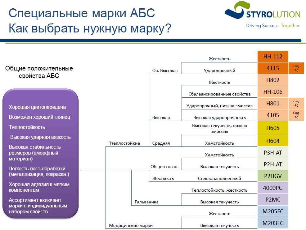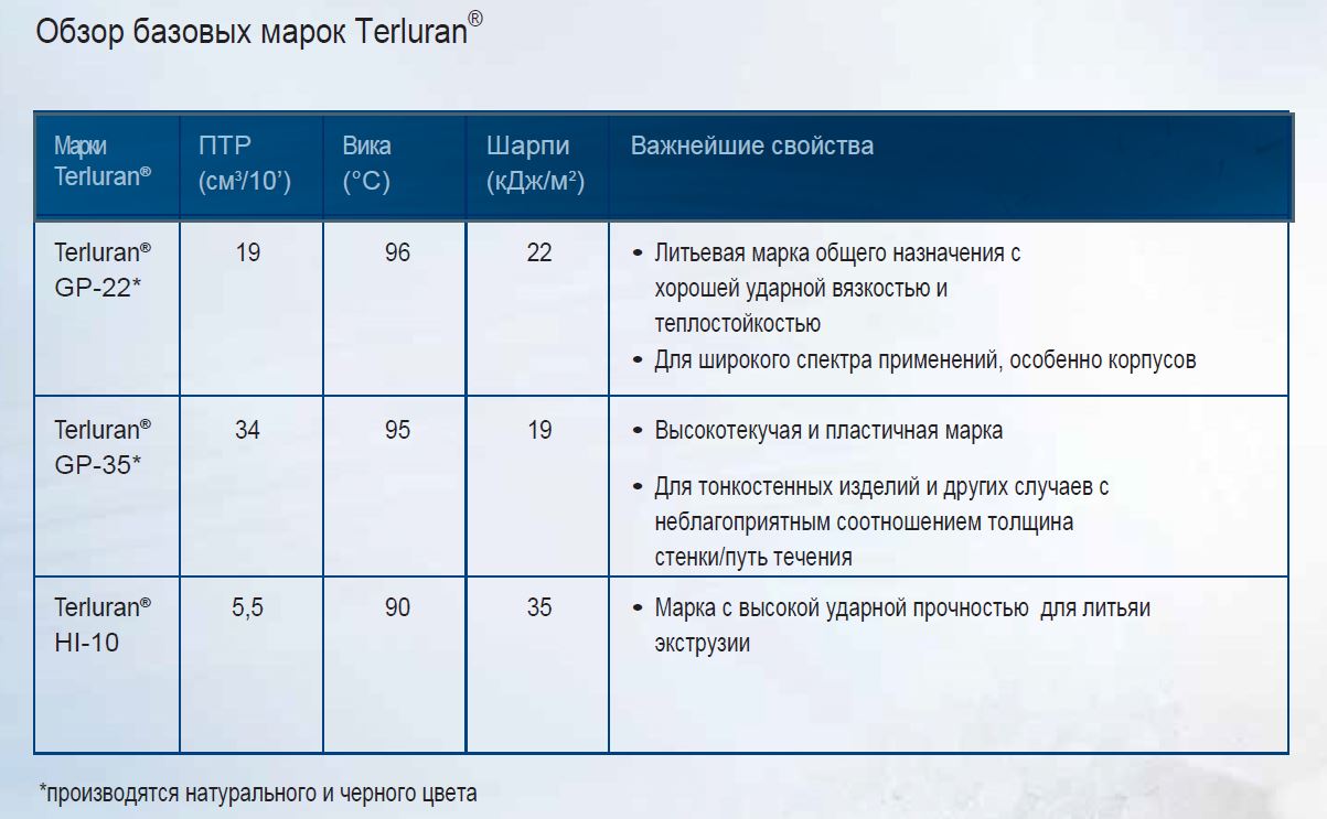 Конкурировать, как мы знаем, можно ценой или рассовывая материал по полочкам, куда другие не могут дотянуться (по свойствам, качеству или просто хитрые применения). Мы, конечно, стараемся использовать все возможности. Для поддержки штанов, которые у нас постоянно спадают (согласно приведенной выше цитате) мы делаем марки Терлуран – стандартного АБСа. Марки Терлурана делаются огромными партиями на полностью автоматизированных заводах (GP-22 и GP-35 производятся в Европе, Азии и Америке), что позволяет серьезно экономить на издержках и продавать стандартные марки по хорошей цене. Терлуран производится натуральный и черный, ходят слухи, что скоро запустят и некий белый, но по мне – лучше бы это осталось слухами. Свойства Терлуранов приведены в таблице ниже: Как видно из таблицы имеется стандартный набор: обычный АБС (GP-22) , высокотекучий (GP-35) и высокопрочный, он же экструзионный HI-10/SP-6 (отличаются системой смазок). Квадратиш-практиш-гут. Почти все продажи АБС вне автопрома в России приходятся на эти замечательные марки.