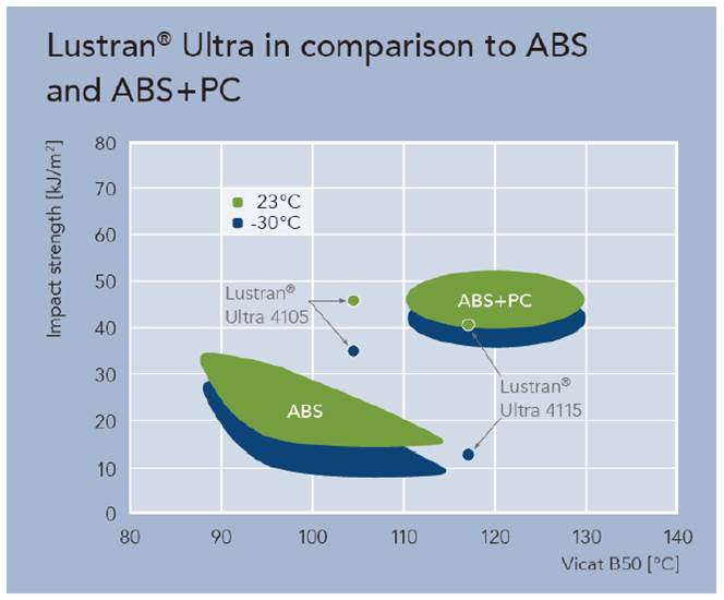 Марки Н801, Ultra 4105, Ultra 4115 – содержащие ПК. В отличие от «классических» ПК/АБС композиций, содержащих около 60% ПК, в наших марках содержится около 30% ПК, что, теоретически, кроме выигрыша в текучести, должно положительно влиять на стоимость. Основные преимущества ПК-содержащих марок – стойкость к удару при минусовых температурах, меньшее содержание летучих.