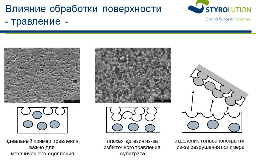 Марка Novodur P2MC – эталон АБС под гальванику в Европе, занимает 60-70% рынка. Разработаны и другие марки для гальванопокрытий, с повышенной теплостойкостью, модифицированные АМСАН (4000 PG) и с ПК (Ultra 4140PG).Марки под гальванику по свойствам очень похожи по свойствам на стандартные марки, например Novodur P2MC, по свойствам – что-то среднее между GP-22 и GP-35. При этом марки под гальванику заметно дороже (не только на рынке, но и в производстве!). Где же экономика? Экономика в том, что стоимость брака и его утилизации в случае изделий с гальванопокрытием гораздо дороже, чем без него, так что применение более дорогого сырья с меньшим процентом брака выгоднее дешевого сырья с формально теми же характеристиками.