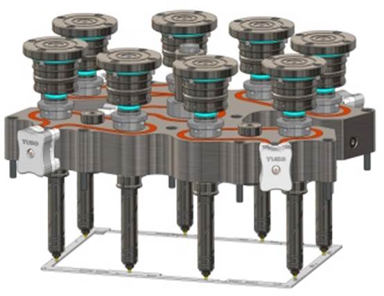 ГК с запираемыми соплами + каскад - все же оптика. Впрыск можно в бурт - но с обратной стороны и съем изделия роботом в неподвижной половины. Либо впрыск в холодные ленточные литники. Будет как то так...Количество сопел конечно поменьше. По 1 на сторону вполне хватит