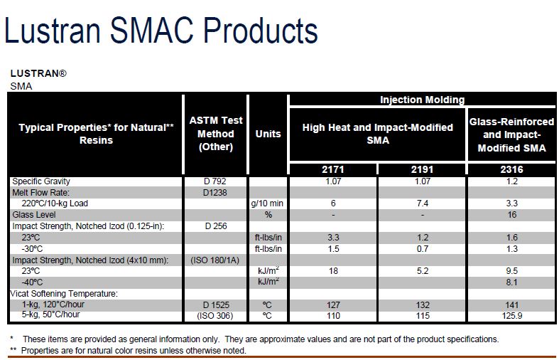 Из интересного - уже упоминавшийся сополимер стирола с малеиновым ангидридом: Кроме того, появилась пара марок массового АБС: Lustran Elite HH 1827 и 1891, характеристики - по ссылке ниже.