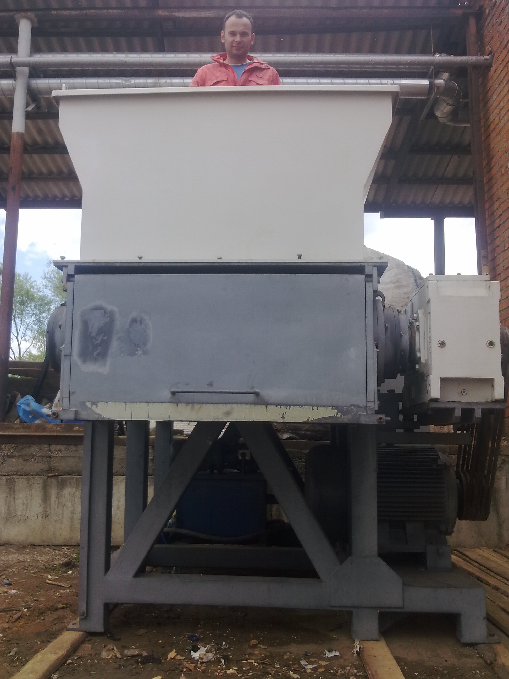 2) Далее без обрезания строп рвем на одновальном шредере. Процедура крайне низкопроизводительная на больших кусках ПП ткани и биг-бэгах. Шредер самый простенький на 18 кВт. Как он, бедненький, мучается........ Часто встает по перегрузу, на вал постоянно наматывается перерабатываемое. ПП мешки правда рвутся без проблем.