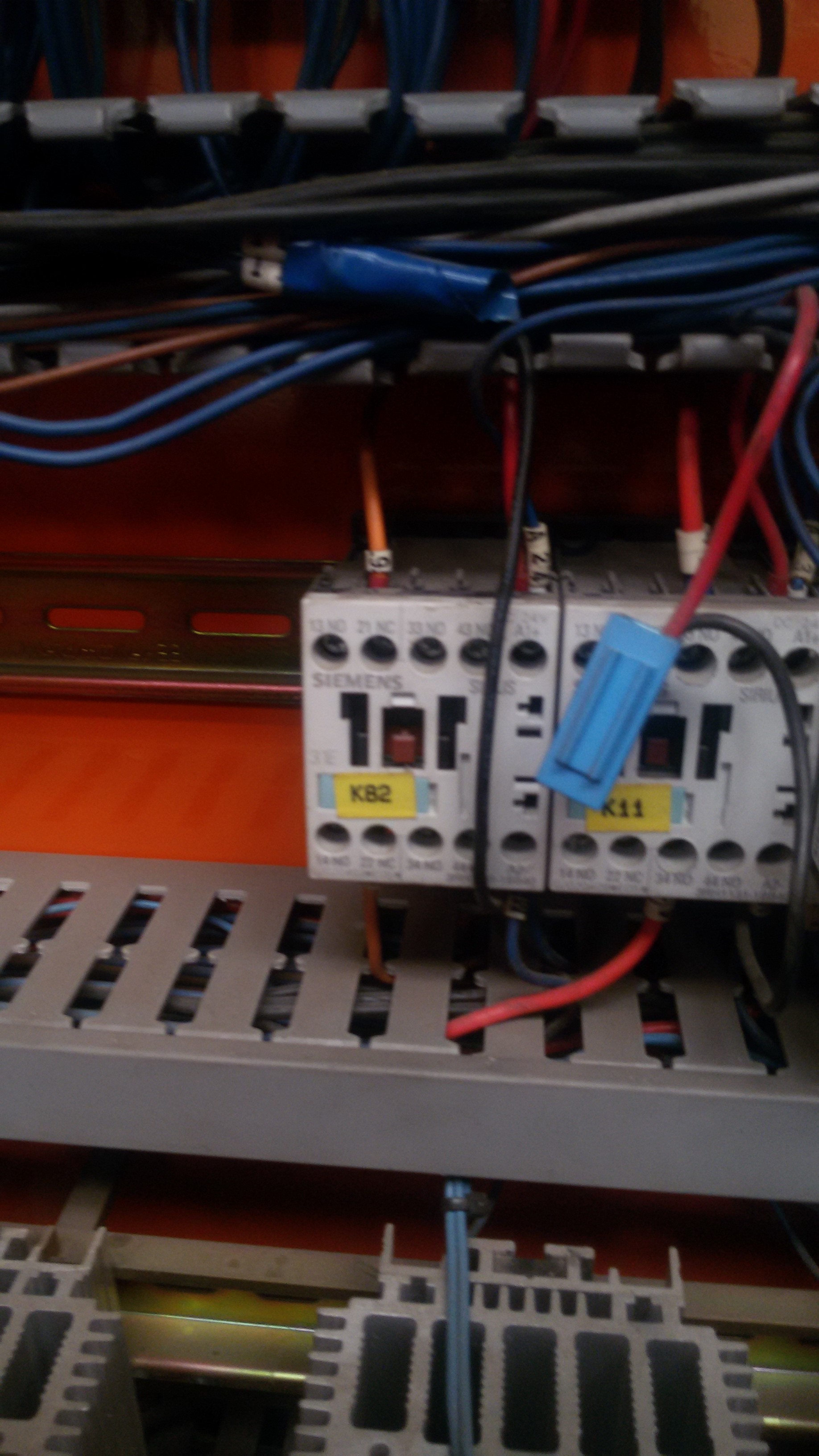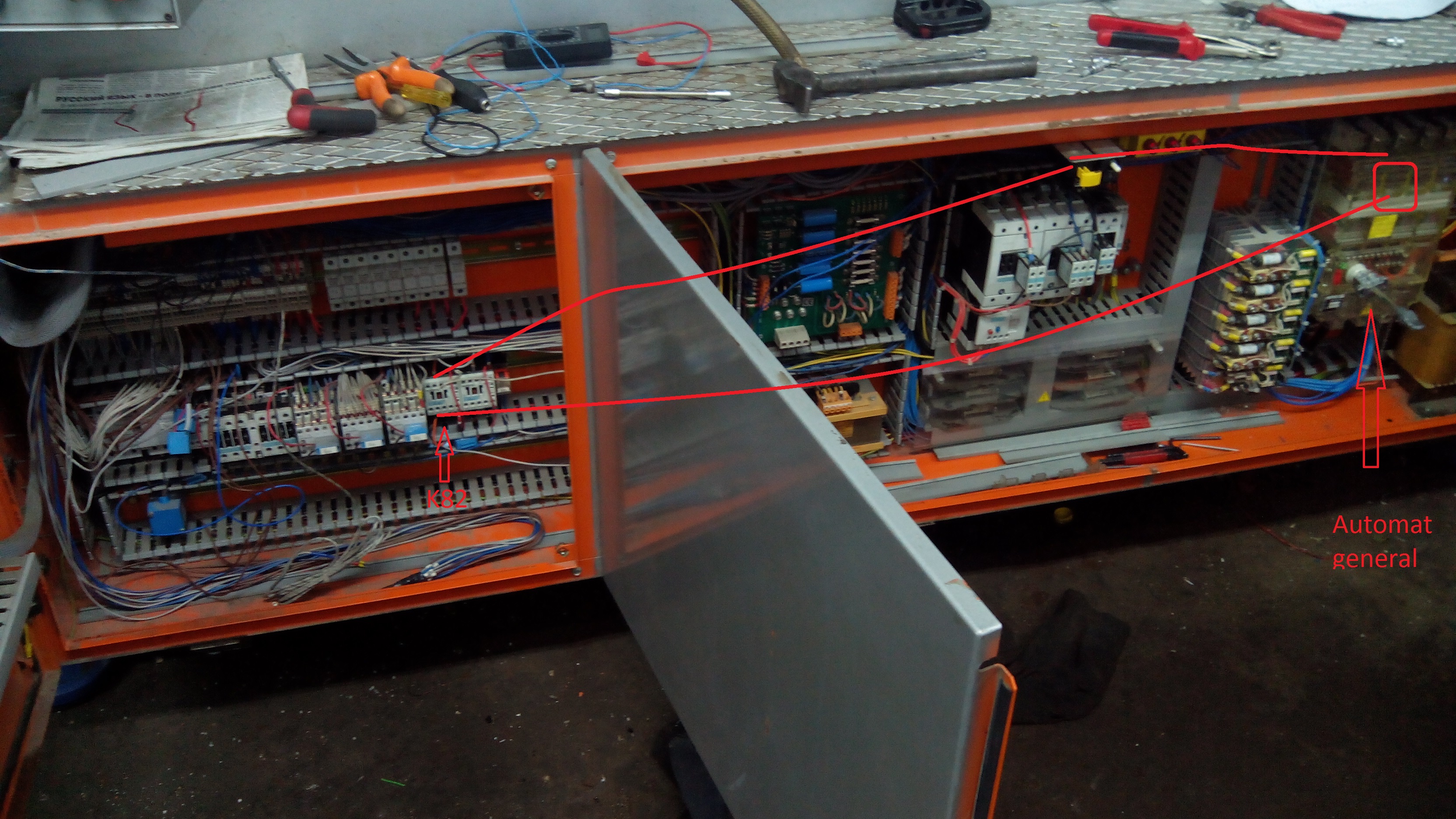 Это аварийная кнопка реагирующая на открытие двери электрошкафа.С ней все в порядке.Разрыв цепи электромагнита в автомате осуществляется либо этой кнопкой,либо пускателем "К 82".Вот этот пускатель как раз и блокирует всю работу,отключает автомат.evgeniialex писал(а):А что за желтая хрень, над пускателями двигателя?