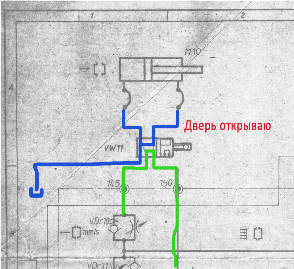 Если давление подаётся сразу на обе полости цилиндра, то перекрученный плунжер в дверной блокировке VW11 самая вероятная причина такого распределения. Однако поток на блокировку нужно подать, значит должен быть открыт(или недозакрыт) VW10. Кстати, ручки регулировки скоростей на смыкание-размыкание ни кто не закрутил 1-го числа?croc писал(а):Посмотри на блокировку под дверью. Может шестеренка неправильно