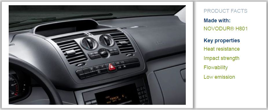 Нижнюю часть интерьера авто мало видно, требований к этим деталям – практически никаких поэтому там применяют ПП или (редко) какой-нибудь самый простой АБС. Это же касается пластика для дверей и сидений. Разве что центральная консоль (между водительским и передним пассажирским сиденьями) может выполняться из стирольных пластиков, например из АБС/ПК.