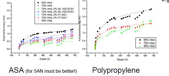 Есть у меня idee fixe о применении САН в ДПК на основе ПВХ в качестве смесевого компонента, а то и основы. Смысл его применения – в той же высокой температуре размягчения, более низкой усадке (и, соответственно - напряжениях), гораздо более низкой ползучести и возможности соэкструзии внешнего прозрачного (или непрозрачного) стойкого к истиранию слоя при сохранении всех плюсов ПВХ-ДПК: возможности покраски, полярности (совместимости с мукой) и т.д. Из минусов и опасностей для ДПК-ПВХ/САН вижу цену, горючесть, хрупкость и более высокую (градусов на 20) температуру переработки. Потенциальным скептикам отвечу, что на счет цены – не обязательно пытаться вписываться в обычную для ДПК цену, т.к. продукт теоретически – премиальный, горючесть и удар полимера при 60-80% наполнителя не играют ключевой роли, а технически экструзия древесно-наполненного САН возможна, т.к. есть мировой опыт производства ДПК даже из ПММА, который хуже течет и перерабатывается при еще более высокой температуре. Понятно, что для небольшого производителя проект таких испытаний затратен, так что мы готовы рассмотреть варианты поддержки такого проекта для создания прецедента. Условия предлагаю обсудить в личке. Соэкструзия с ПВХ