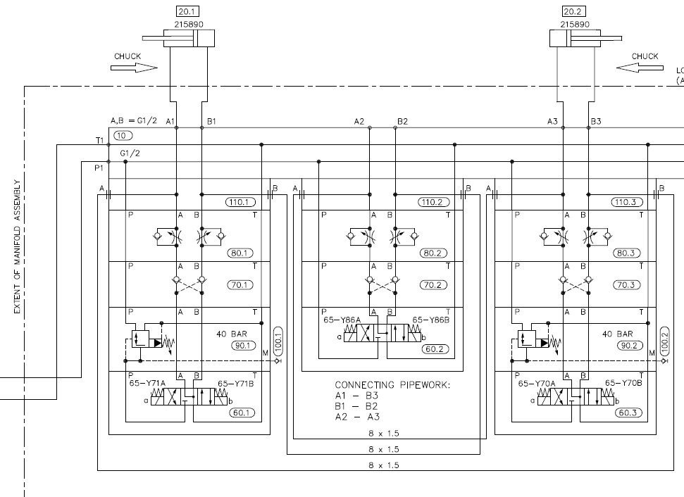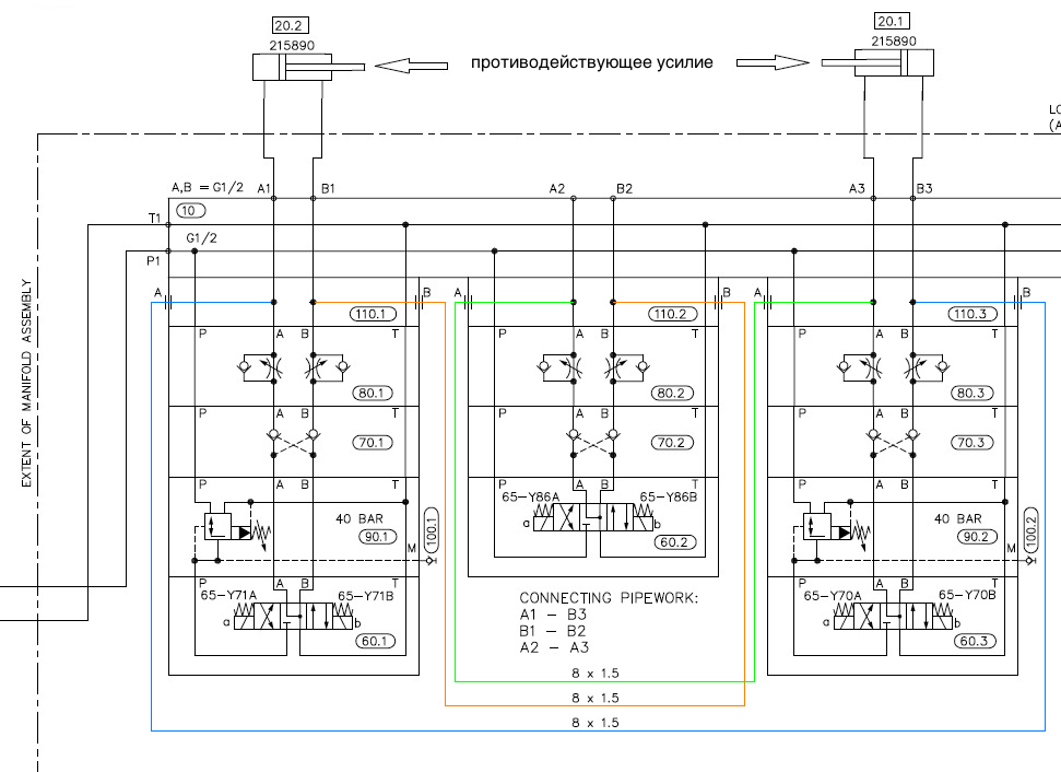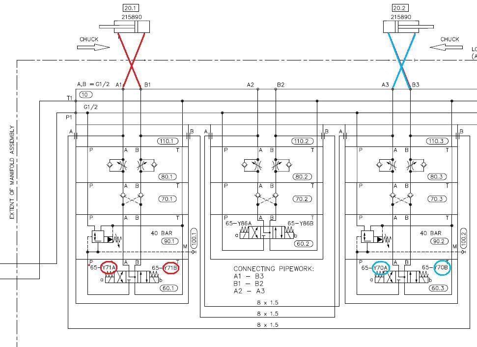 Соединения идущие к цилиндру 20.1 А1 и В1 поменять между собой местами, а на цилиндре 20.2 А3 и В3 между собой. Также придется поменять разъемы на катушках распределителях 60.1 и 60.3 А с В местами.