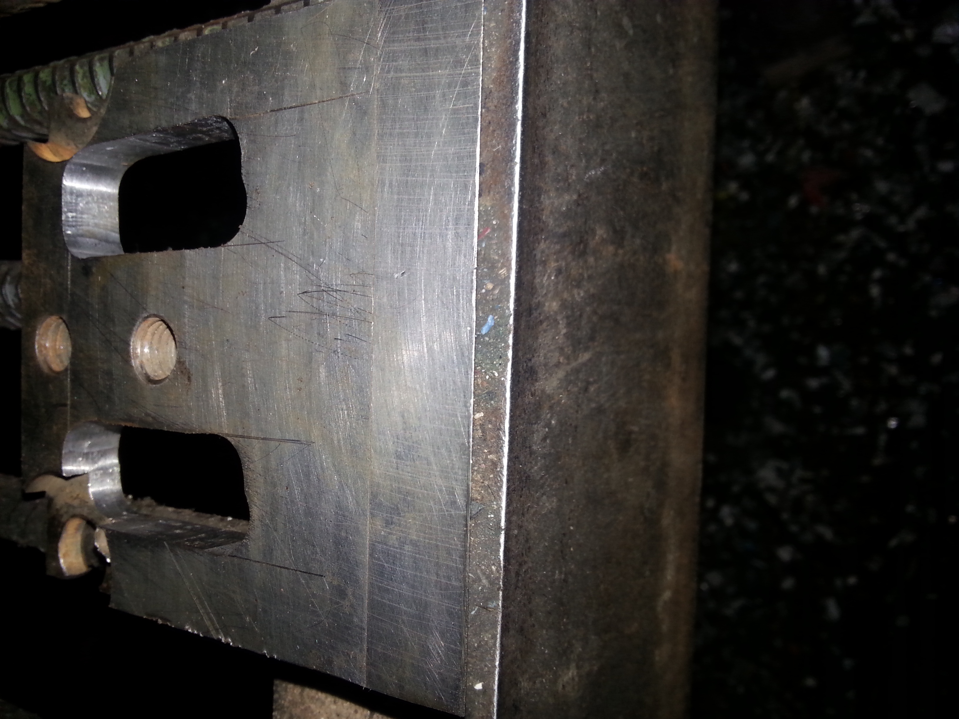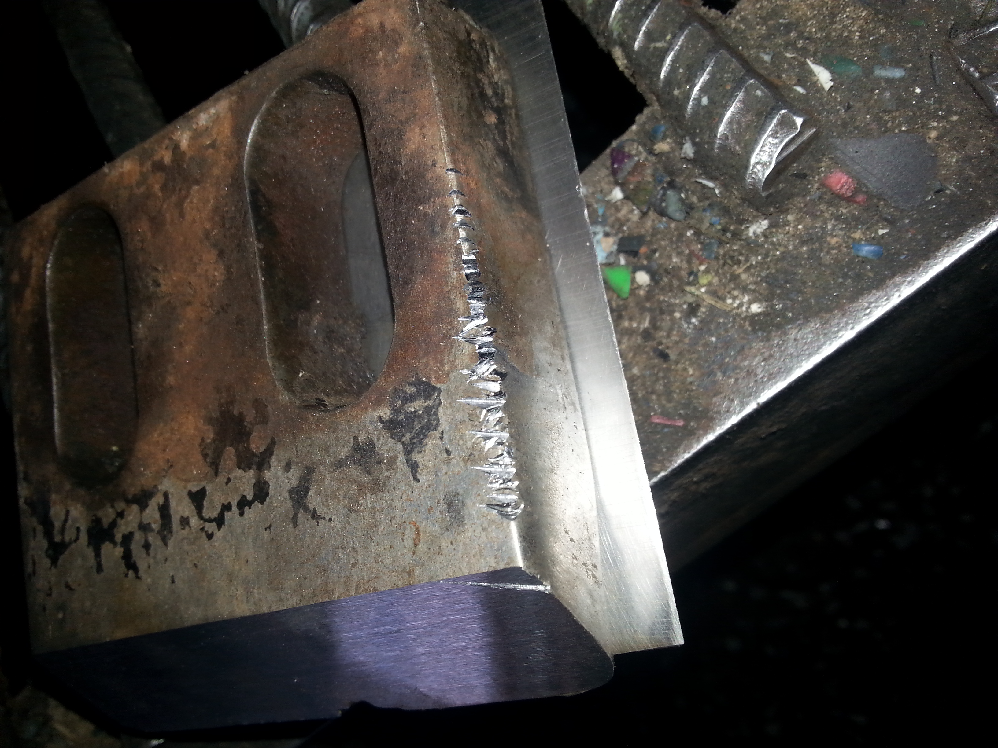 Где такие делают не знаю. Знаю что используются для резки бумаги, а точнее банкнот в одной конторе по их изготовлению. Мне они попадают из списанных. А потом уже выкраиваем нечто подходяшее для закрепления на роторе дробилки. Нож такой ходит примерно 40 тонн на канистре ПНД с полигона, потом затачиваем. На ноже твердосплав толщиной около 5 мм. Из металла еле желтого цвета, из чего незнаю. Сам нож состоит из 2-х пластинок из металла с разным направлением зерна, видно на фото. Арматуру 10 мм. в дробилке рубят без особых последствий. При попадании каленого металла вроде подшипника нож страдает сильно. Твердосплав выкрашивается в месте удара, а сам нож гнется. Твердость металла из которого сделан нож выше чем у толстого ножа, но сам металл не имеет закалки ибо он не ломается и его можно выпрямить.