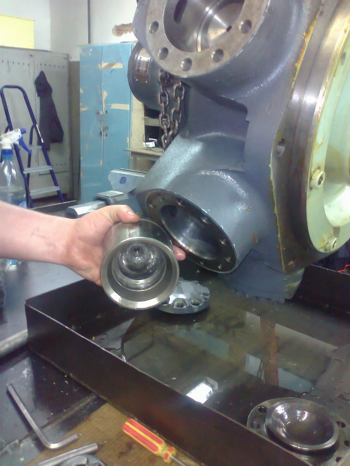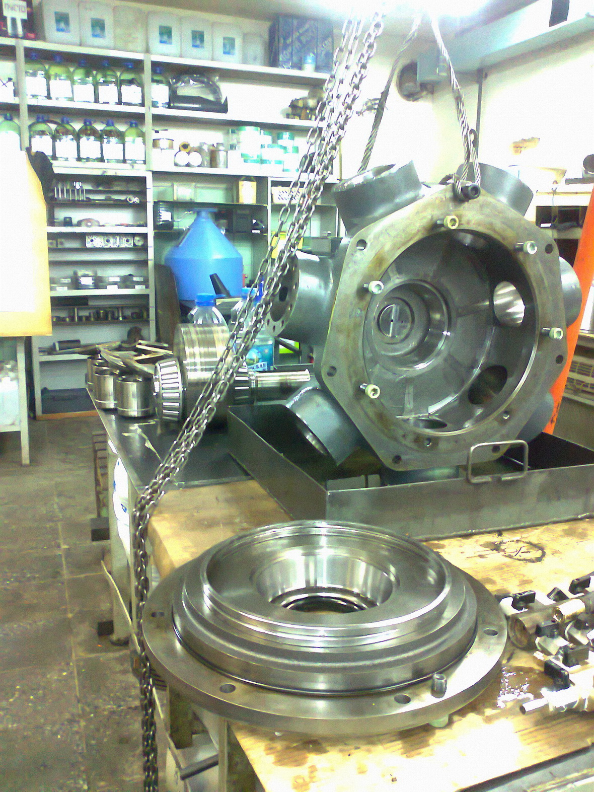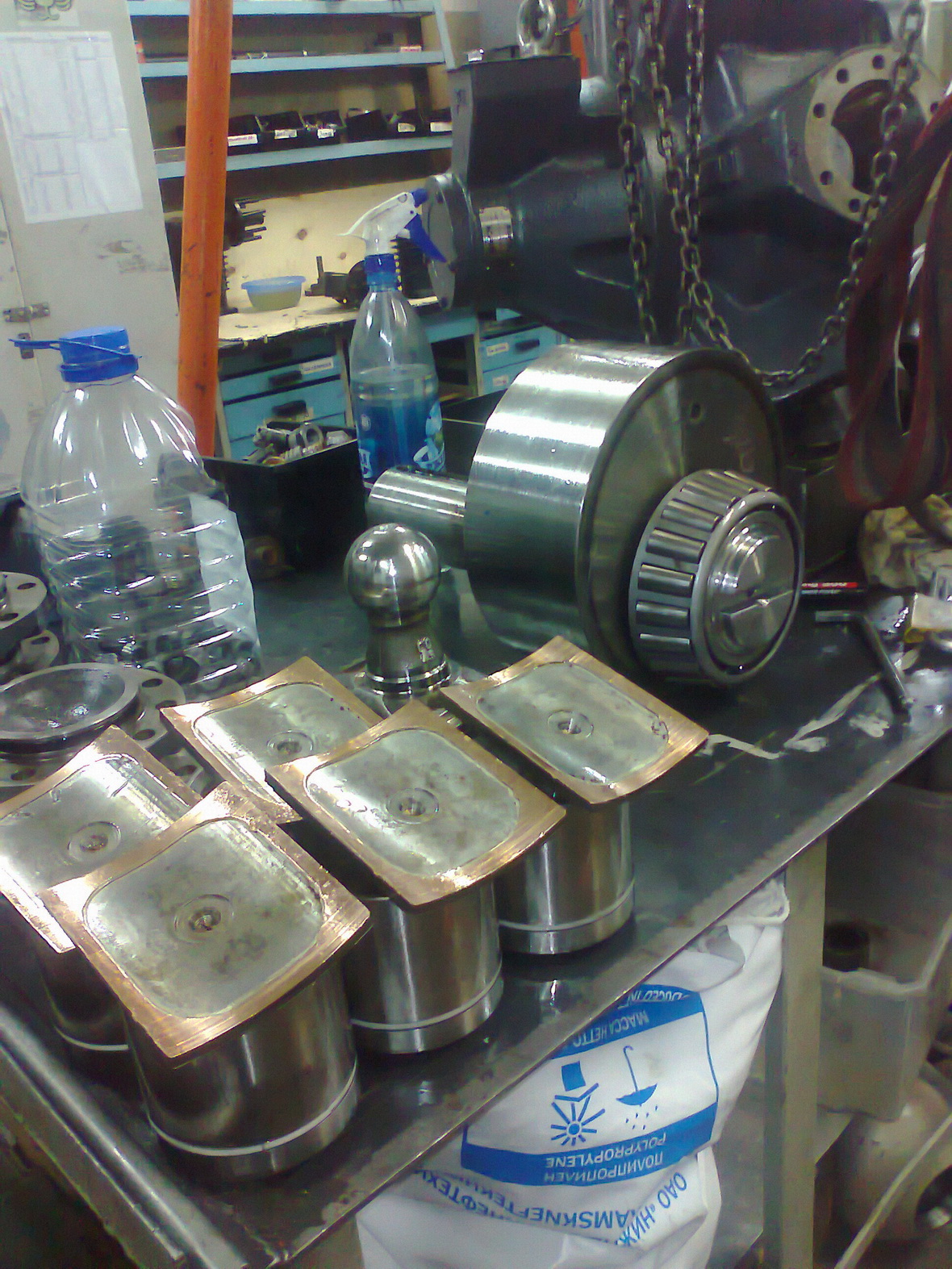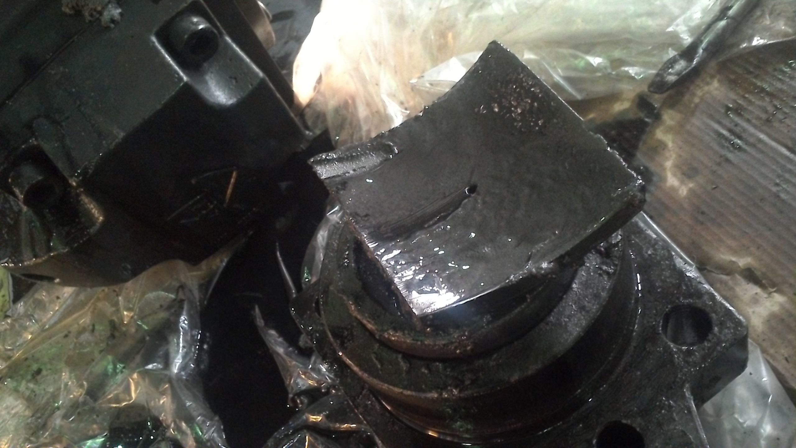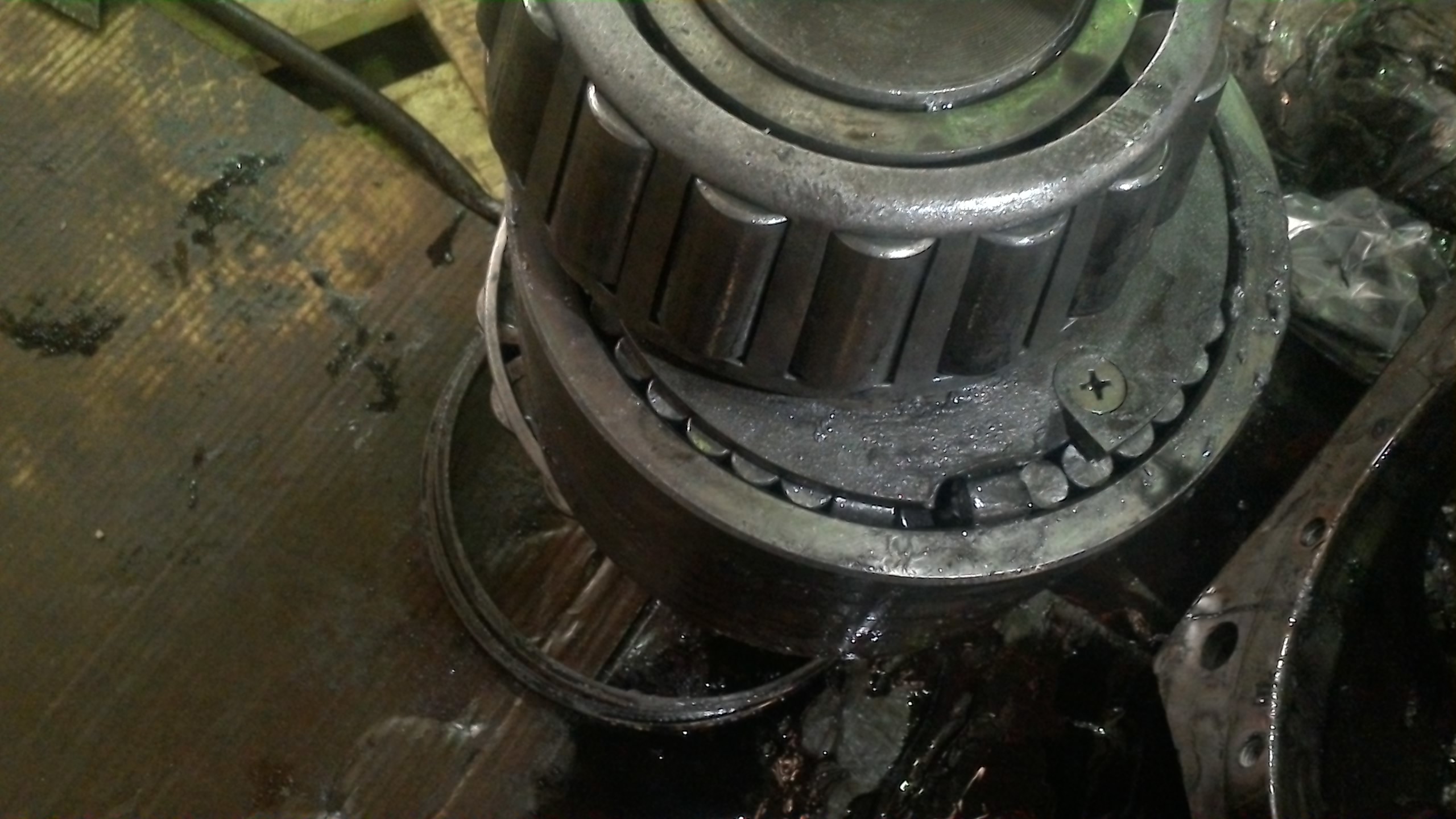 1) Без гидромотора и и шнека, муфта с тремя подшипниками и упорной шайбой проворачивается с небольшим усилием руки. В любую из сторон. Смазка уже отработанная, но свои функции все еще выполняет. Люфта подшипников нет. Т.е. первый вариант отпадает.