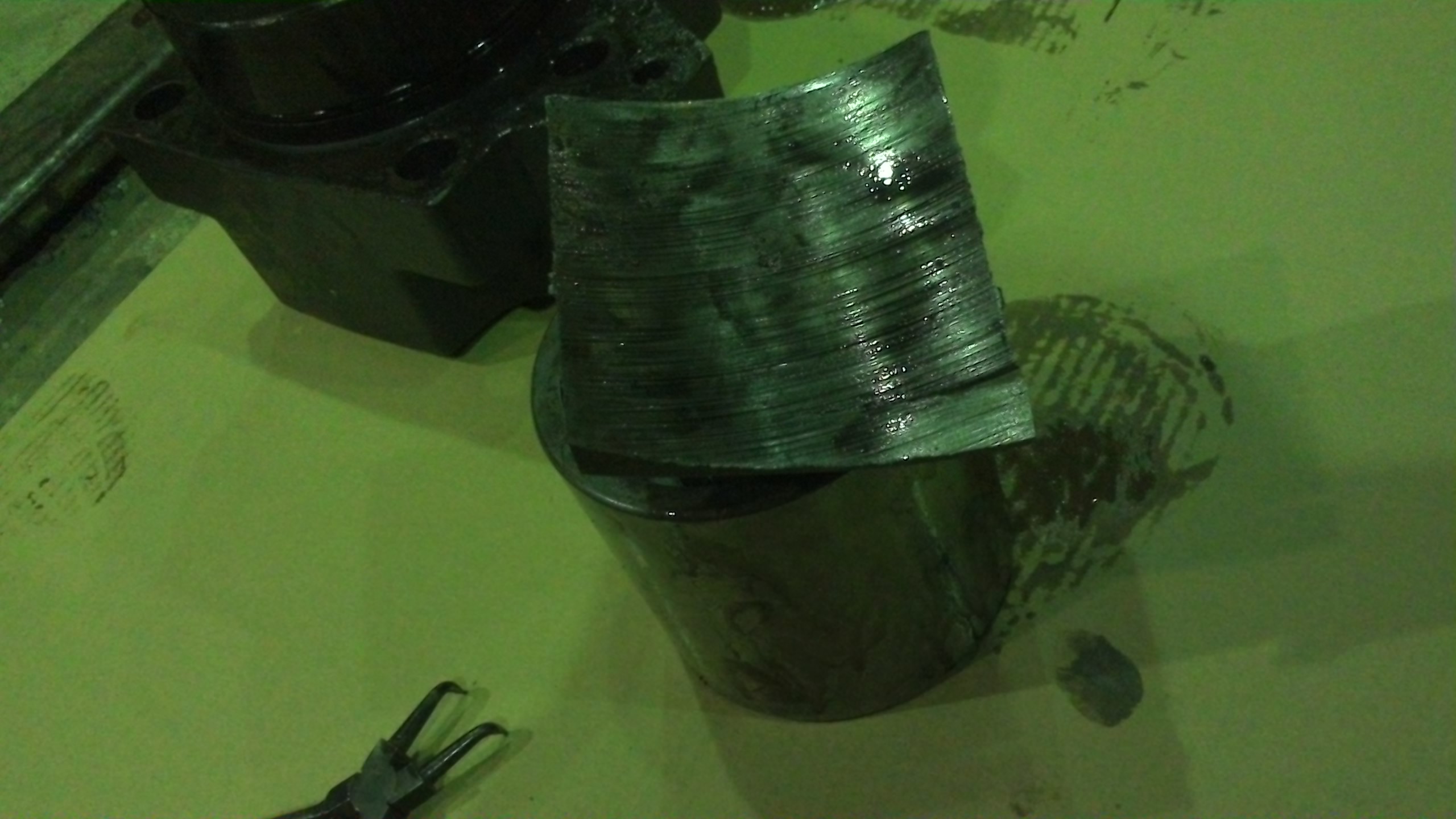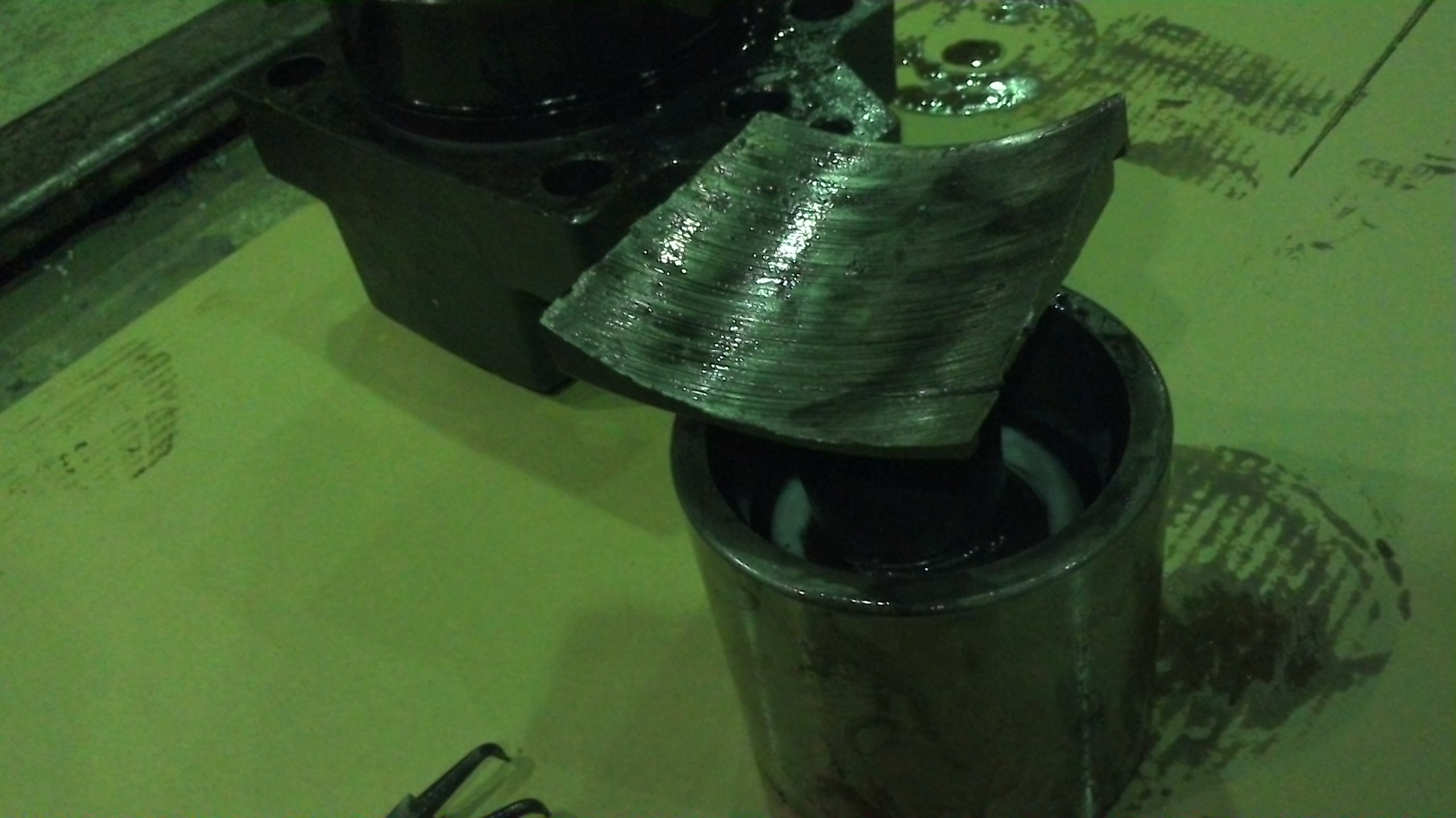 a_kovalenko у вас заклинил подшипник на эксцентрике (рассыпался сепаратор), наружная обойма его не должна была крутится и подошва плунжеров не рассчитана на трение с обоймой.