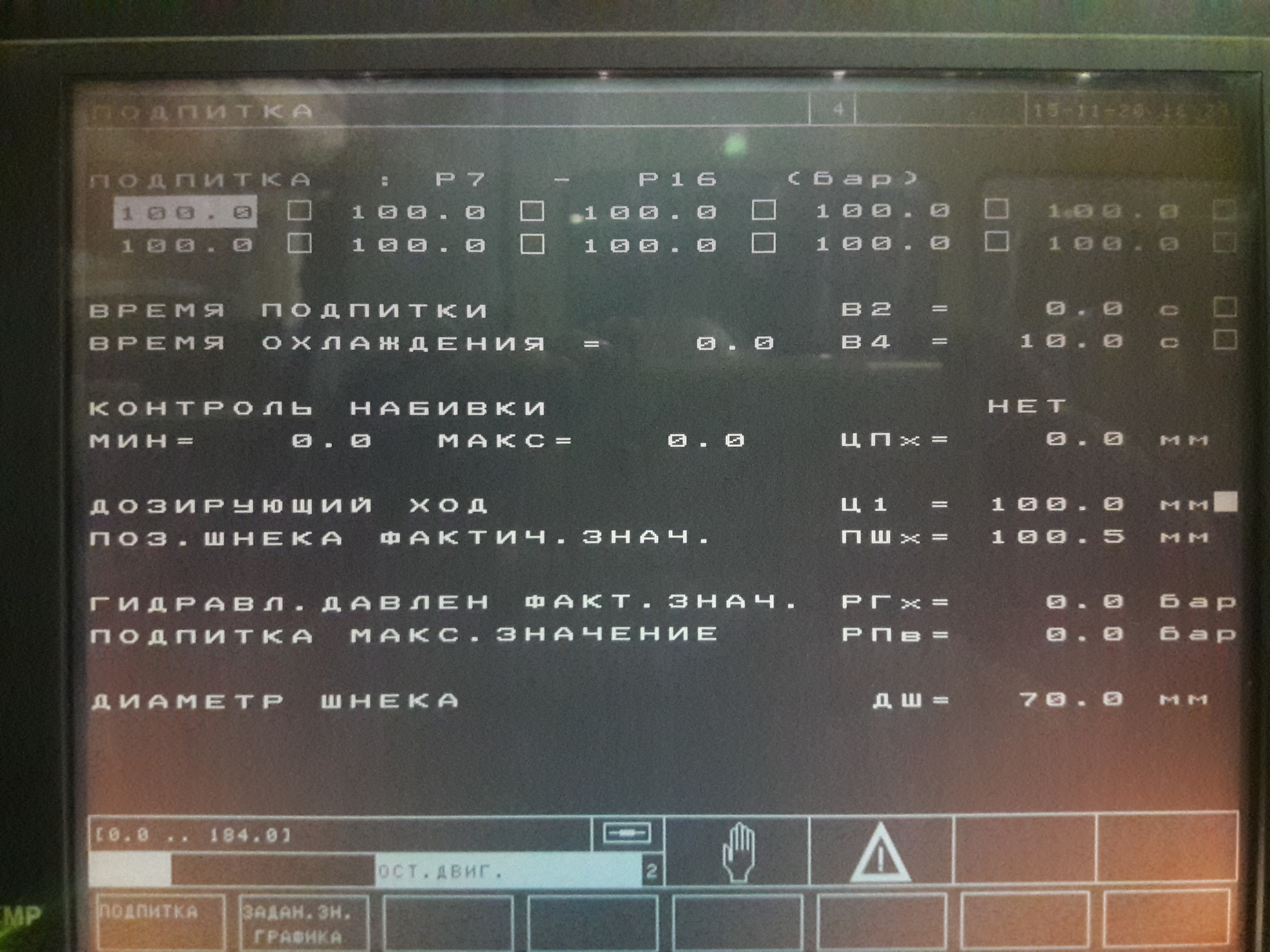 Приобрели данную машинку , была сгоревшая материнка, мать сделали , вроде бы все смог настроить запирание , набор дозы, толкатели , но вот проблема при запуске в полуавтомате или в автомате форма закрывается ,каретка подъезжает и все просто стоит впрыска нет , в ручном все работает, подозреваю что не выставлено давление на прижым сопла подскажите где его в меню искать буду очень благодарен.