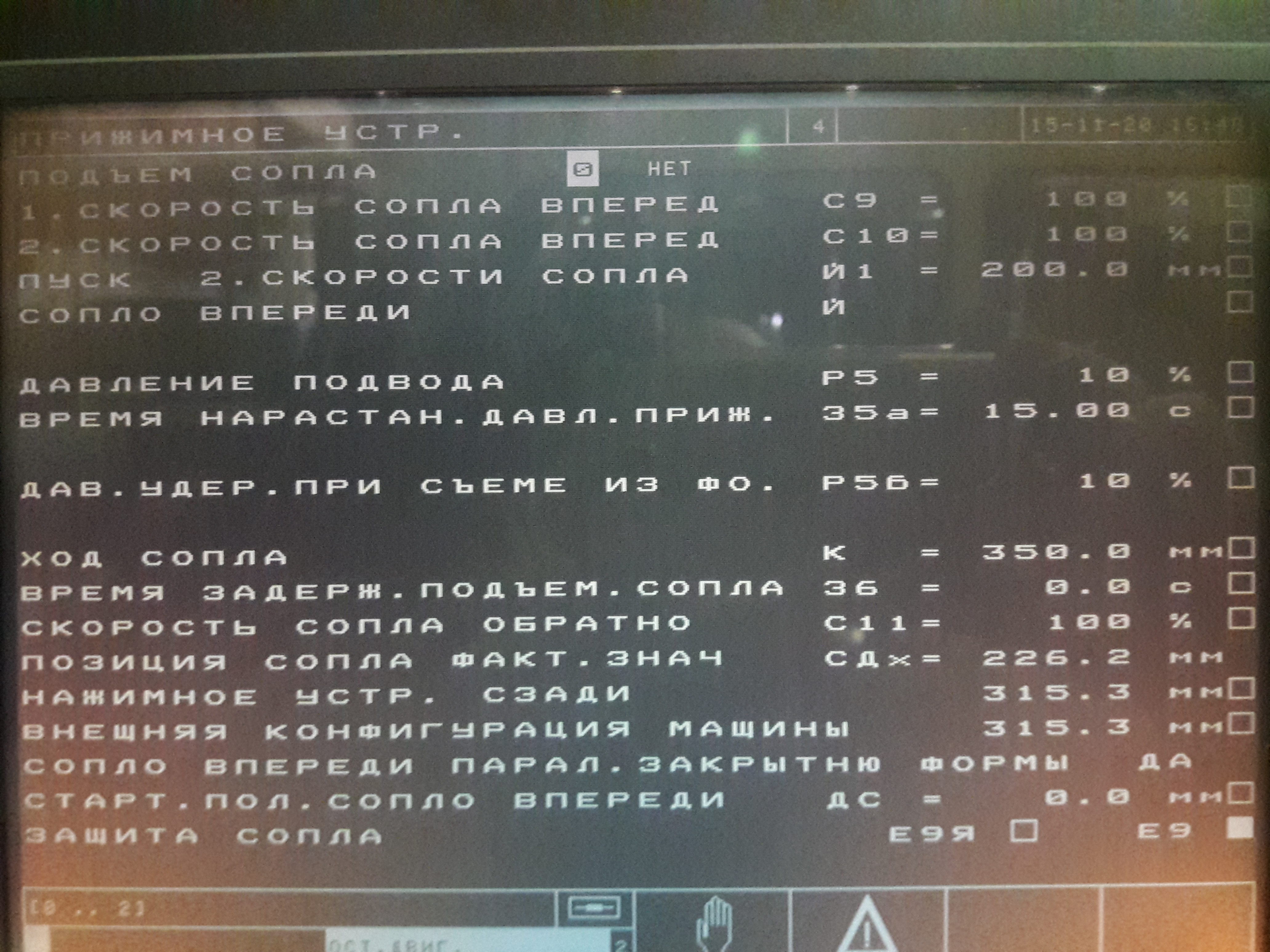Старт положение сопло впереди показывает реальное положение каретки и выставляется автоматически , тоесть при отводе сопла на назад там будут цфры на какое расстояние оно отошло , опция одновременного подвода сопла автоматом подводит сопло при закрытии формы при выключенной опции сопло нужно подводить в ручную , концевиков на форме как в прочем не где на ней нет все на линейках , линейки работают (киповцы раз 30 все проверяли , гидравлика работает механики все перебрали ) у меня уже мозг дымит от этой машины
