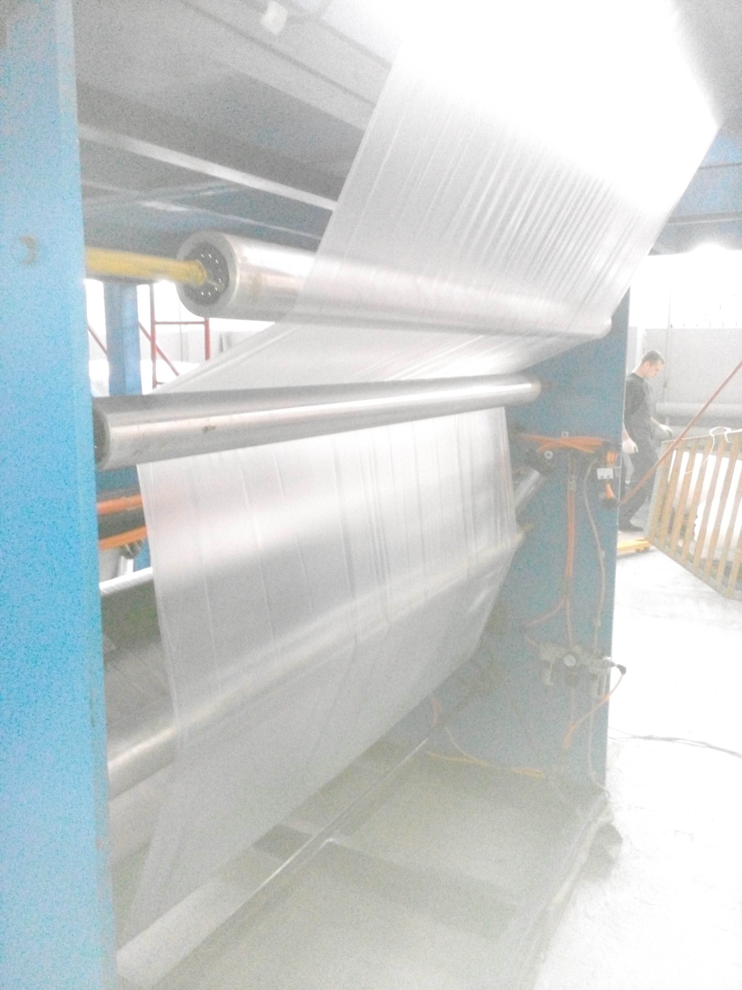 Толщина именно полотна 150 мкм, поэтому разнотолщинность +-10%. Скользячку не применяемых вообще. Натяжение плёнки так и растёт у нас. Фальцы прожодя от вытяжных валов до промежуточных уже начинают прописать и заминаться. Устройства регулирования положения края кромки нет.