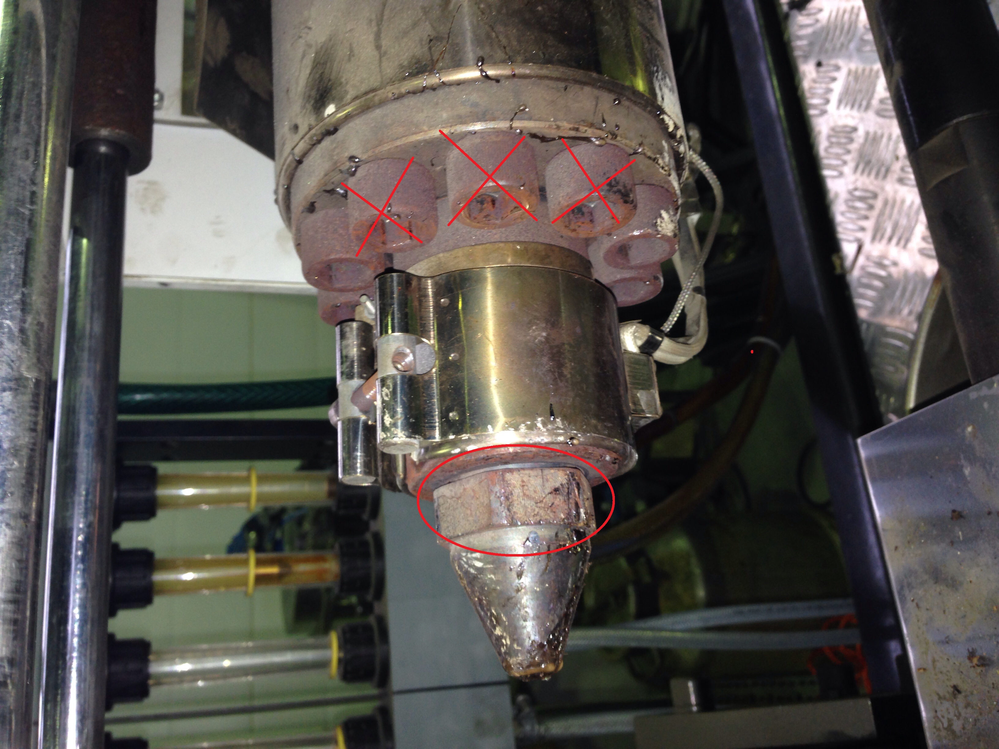 В самой шнековой паре забиться нечему и негде, может только сам мундшук, или переходник запираемого сопла( было на хмельницких ДЕ-шках), но у китайцев сопло открытое, по умолчанию. Если не поставили фильтр расплава... Поэтому фотку носа в студию.