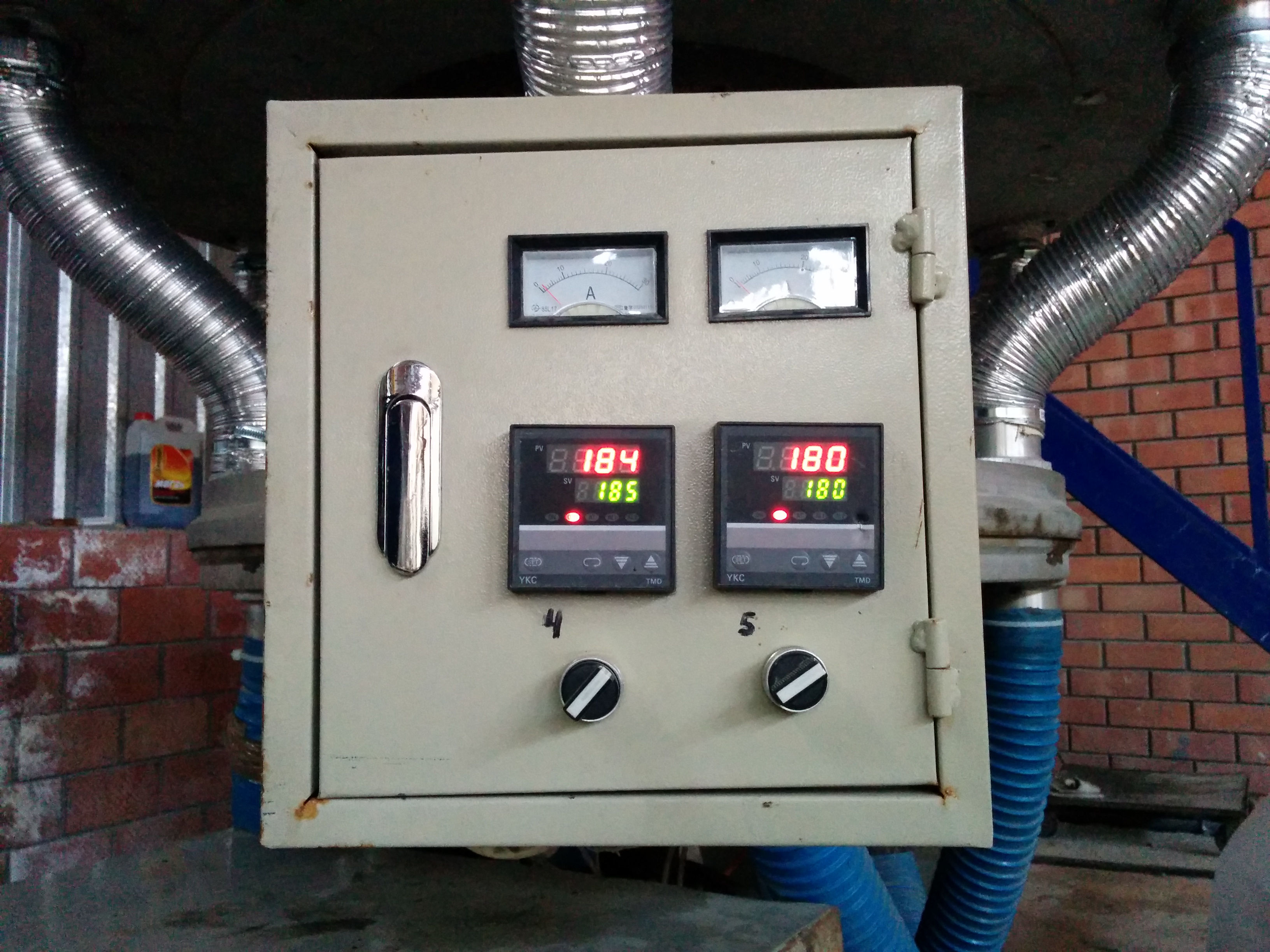 Вероятно фото шкафа сделанно на прогреве ...,температура первой зоны ниже чем уставка ,но ток то на амперметре в норме ,да и частота на двигателе шнека в 15 герц не для максимальной ширины .