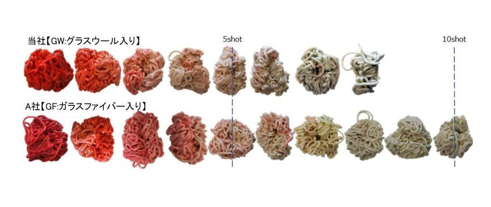 Чтобы очистить шнеки и цилиндры термопластавтоматов еще более эффективно, японский производитель использует стекловату в чистящих гранулах. Стекловата вместо стекловолокна в качестве наполнителя увеличивает площадь поверхности наполнителя, что дает следующие преимущества: