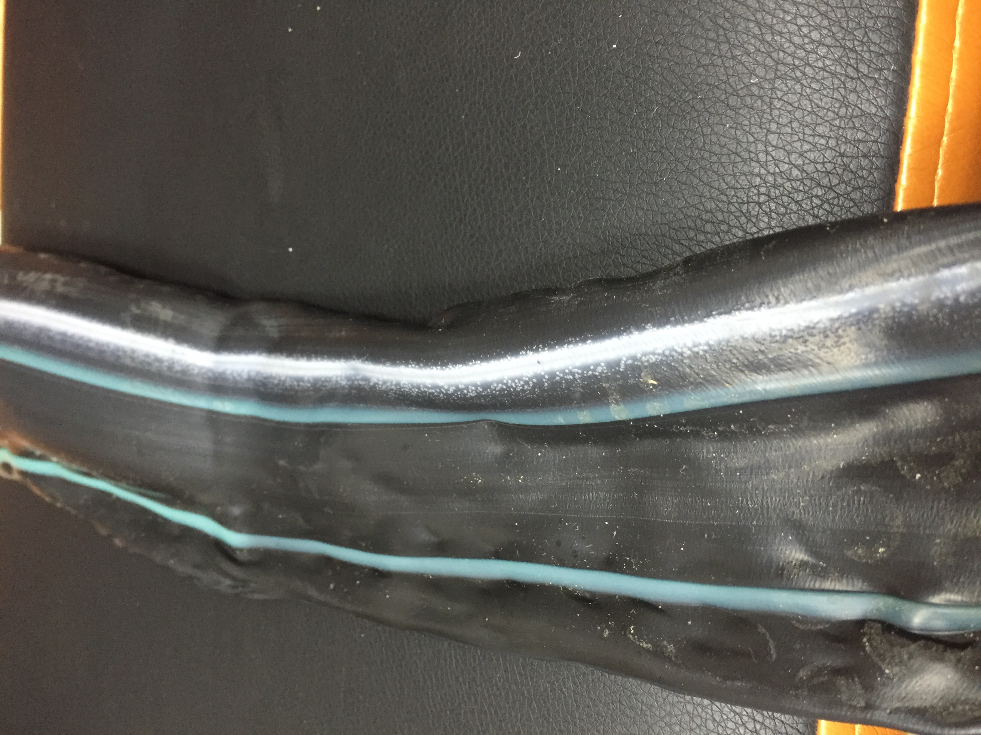 На вопрос непроплавы или воздух ответ с большей вероятностью воздух ,так как гидравлическое испытание дало течь ( чё бы течь на не непроплавах то ?а на воздухе легко ,рвется там где тоньше ) . Захват воздуха мало вероятен ( включения идут строчкой ,а не по всему рукавчику) .Тоесть газ деструкции . Причин может быть две : огромное выделения тепла от трения или застойная зона . Применение процессинга могло дать положительный эффект в обоих случаях ,периодичность выхода пузырьков может говорить как о застойной зоне ,так и о нестабильности свойств 293го при высекании пузырьков от трения ,но выход прозрачной массы в черном говорит о застойной зоне . Но однозначный вывод сделать сложно . Если предположить что застойная зона в спиральках ...( я так понимаю что проблем с зелеными полосками нет ,а материал вероятно один и тот же в обоих шнеках) то опять у нас два путя ...или головка изначально неможет работать на расплаве определенной вязкозти ,или с головкой что то произошло и она уже не может нормально работать .