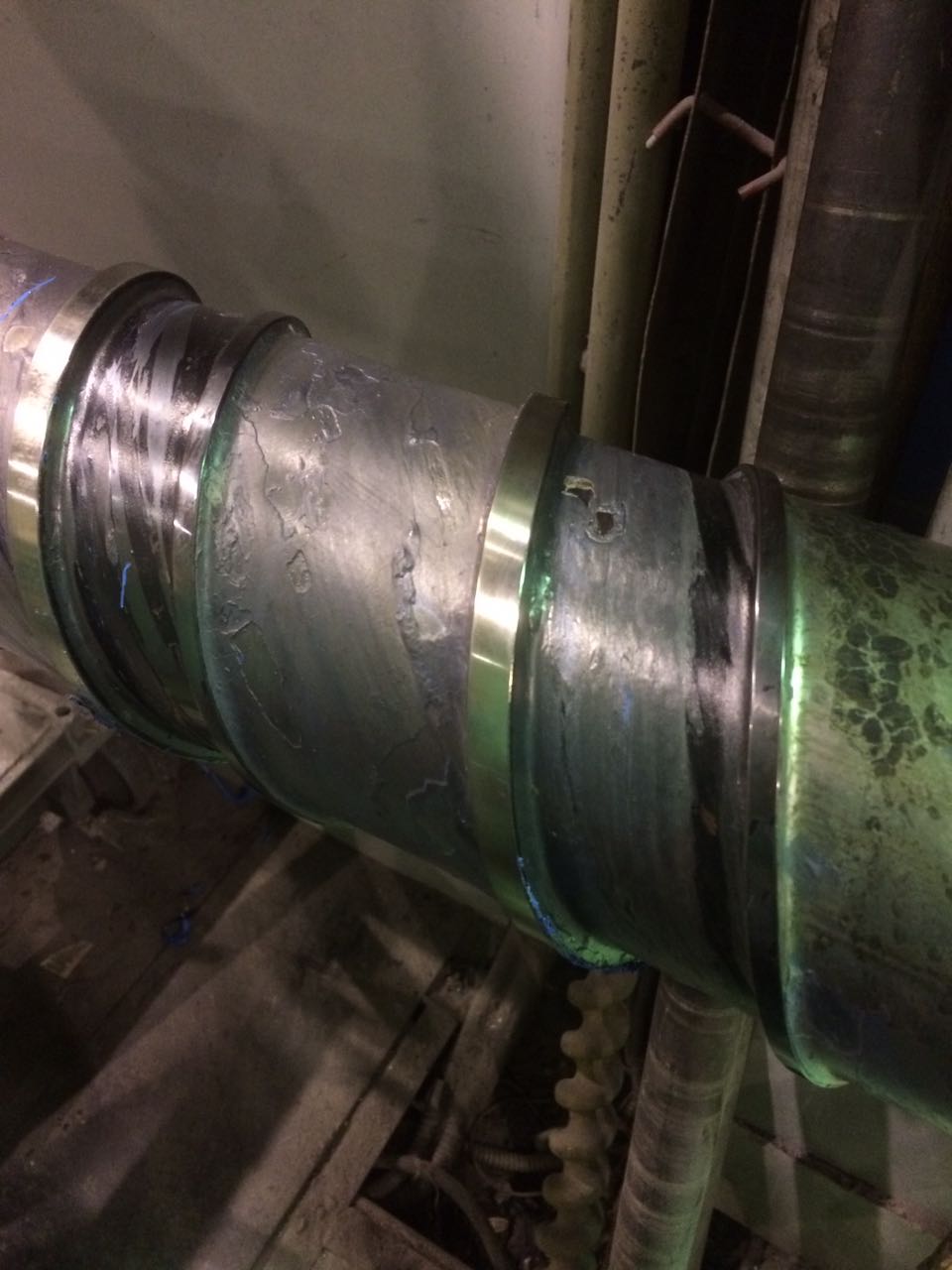 Коррозия могла образоваться и за сутки, если оставить линию с сырьем под нагревом и/или если шнек не из кислотостойкой стали и/или если плохой проток воды по шнеку.