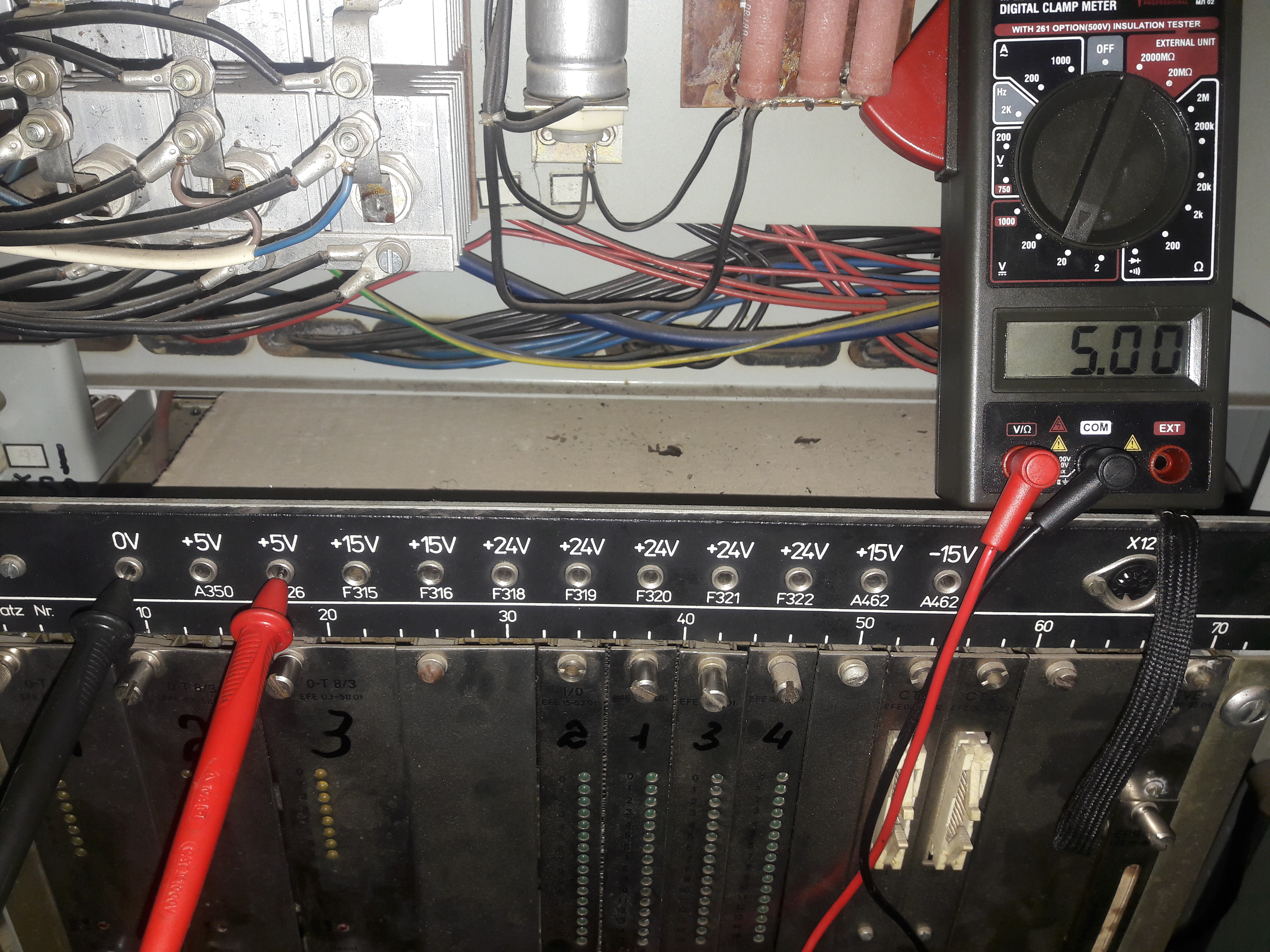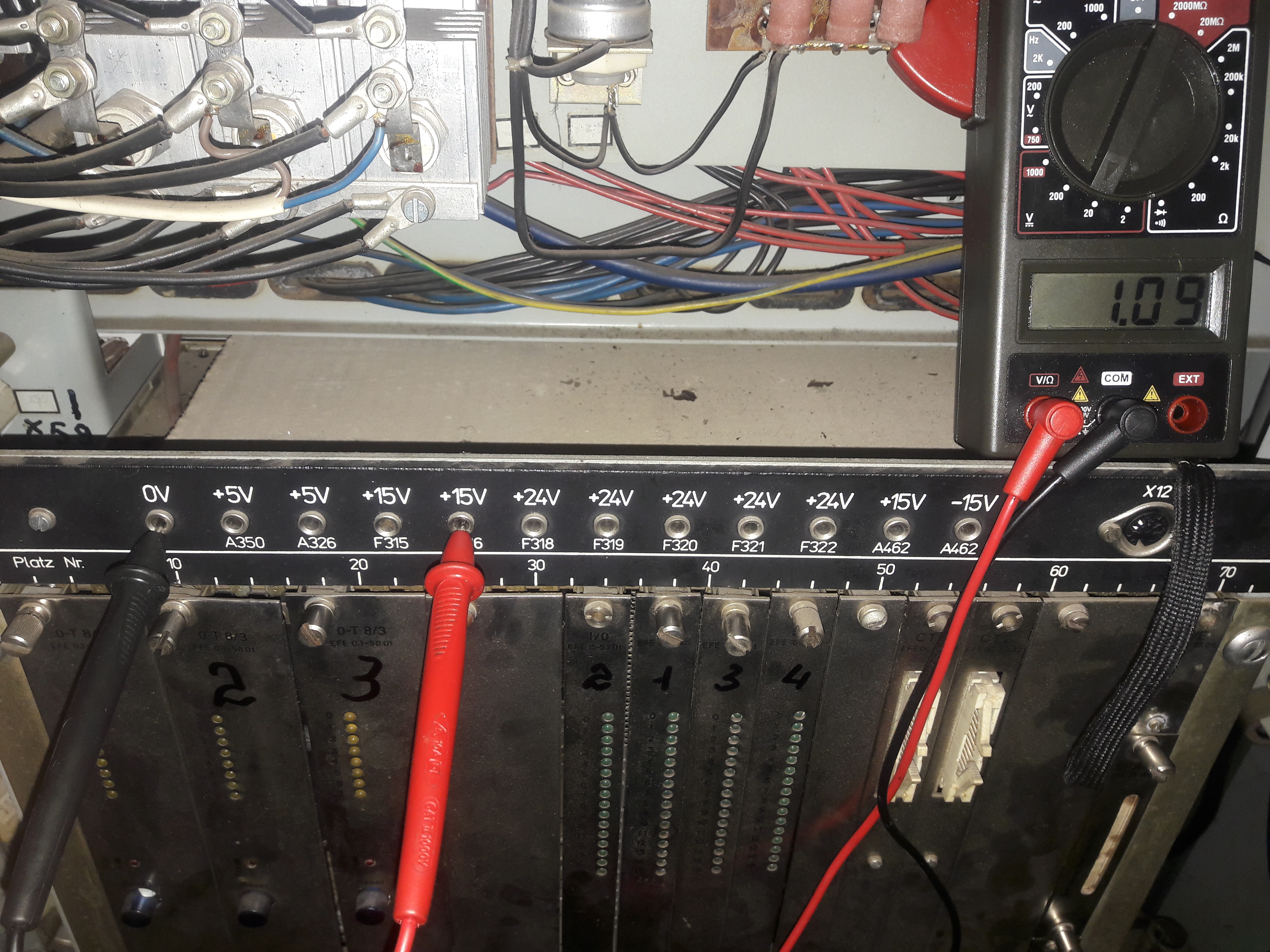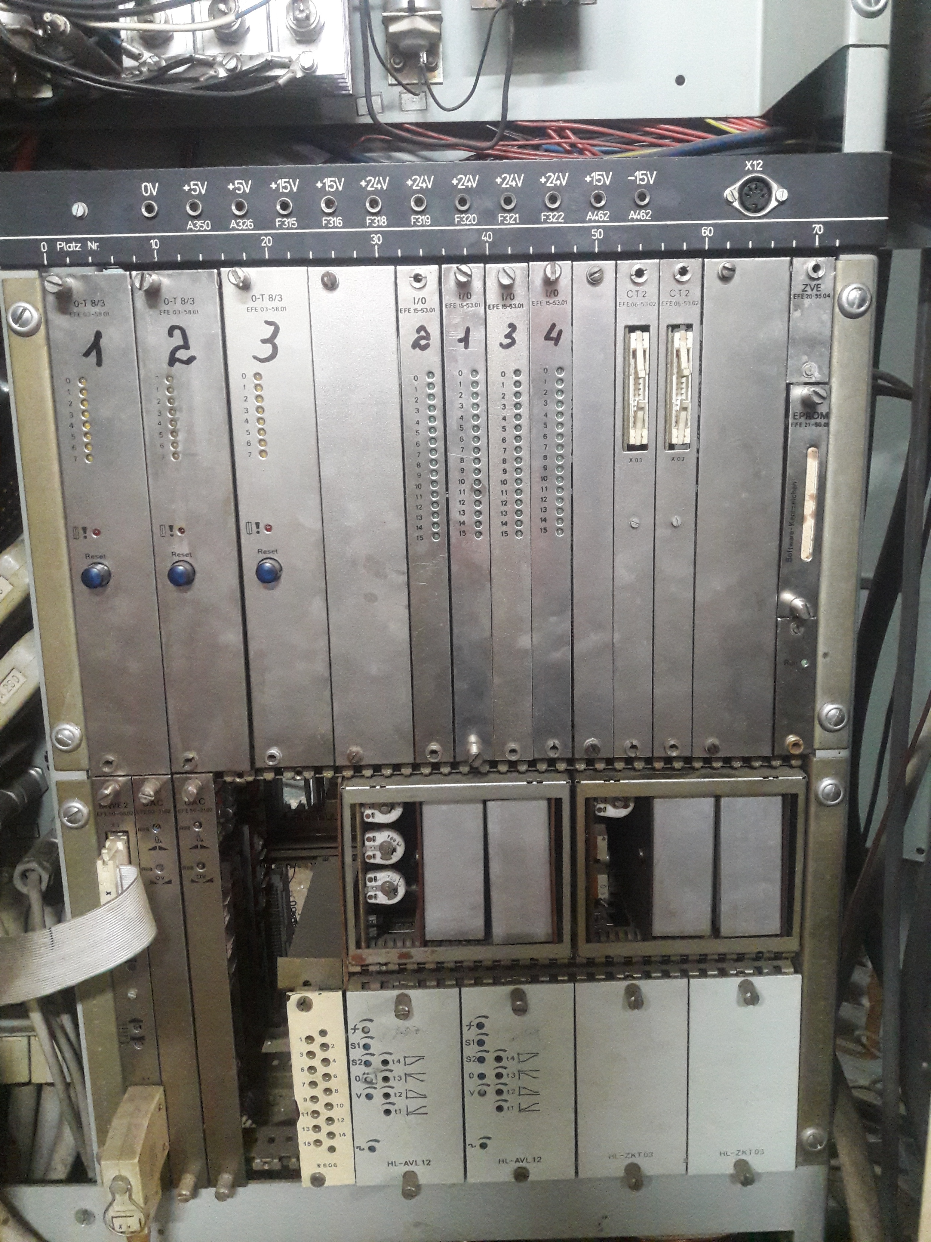 Ситуация такая: если я правильно понимаю то, при включении тпа в течении буквально секунды электроника делает опрос. На фото видно горят четыре символа похожие на букву А. Но они должны погаснуть по истечению буквально секунды (если все исправно) и загореться 0 и красный светодиод (указывающий на сбой, неисправность в работе). Но этого не происходит. Горят эти четыре символа и S4002. С наружи шкафа все, теперь внутри: не горит на плате ZVE светодиод Run. Напряжение 5V есть. Смущают показания на двух 15V. Предохранители целы. Менялся комплект плат I/0 все четыре и ZVE сама плата а плата с программой не менялась. Реакции ноль.