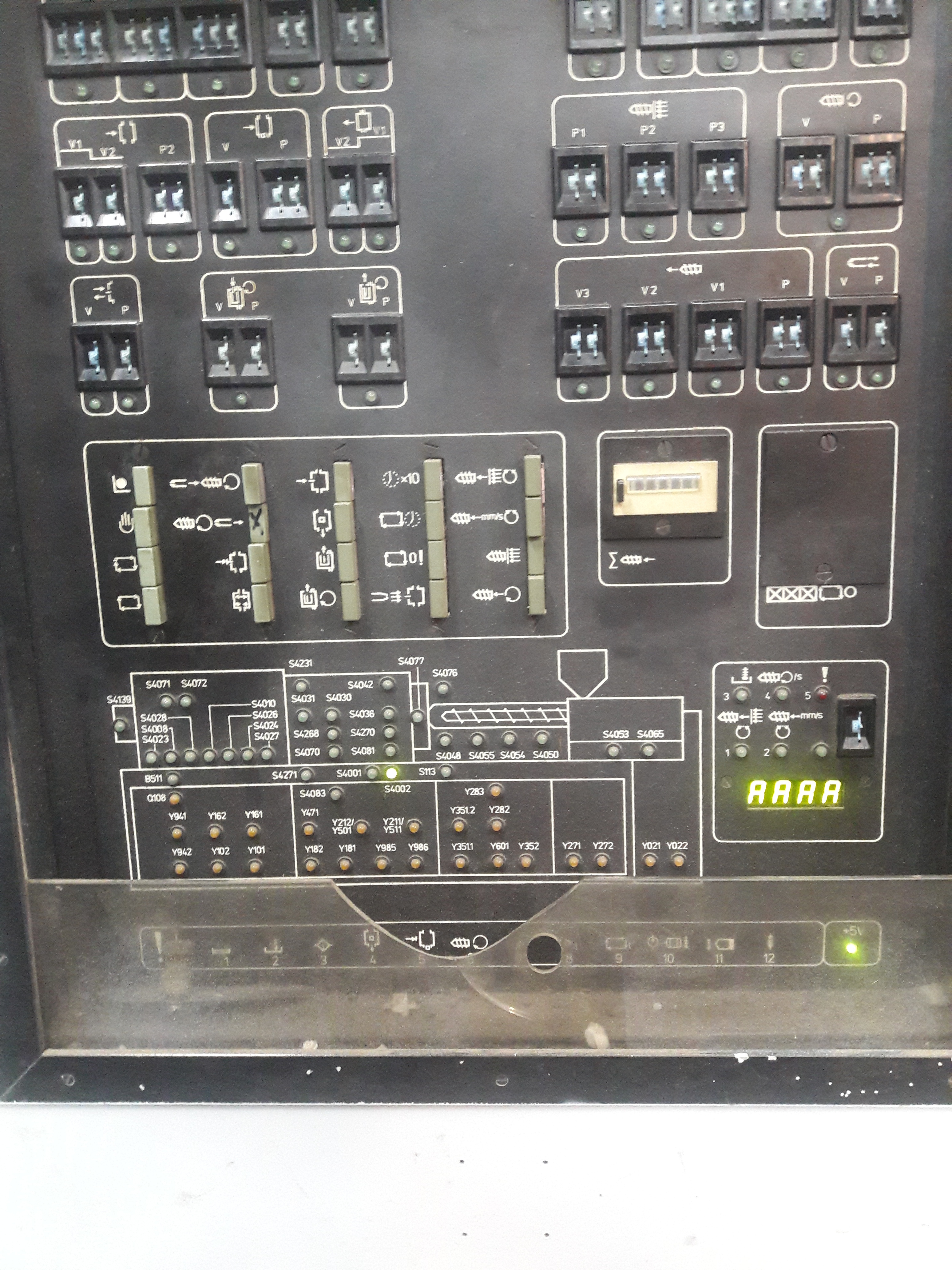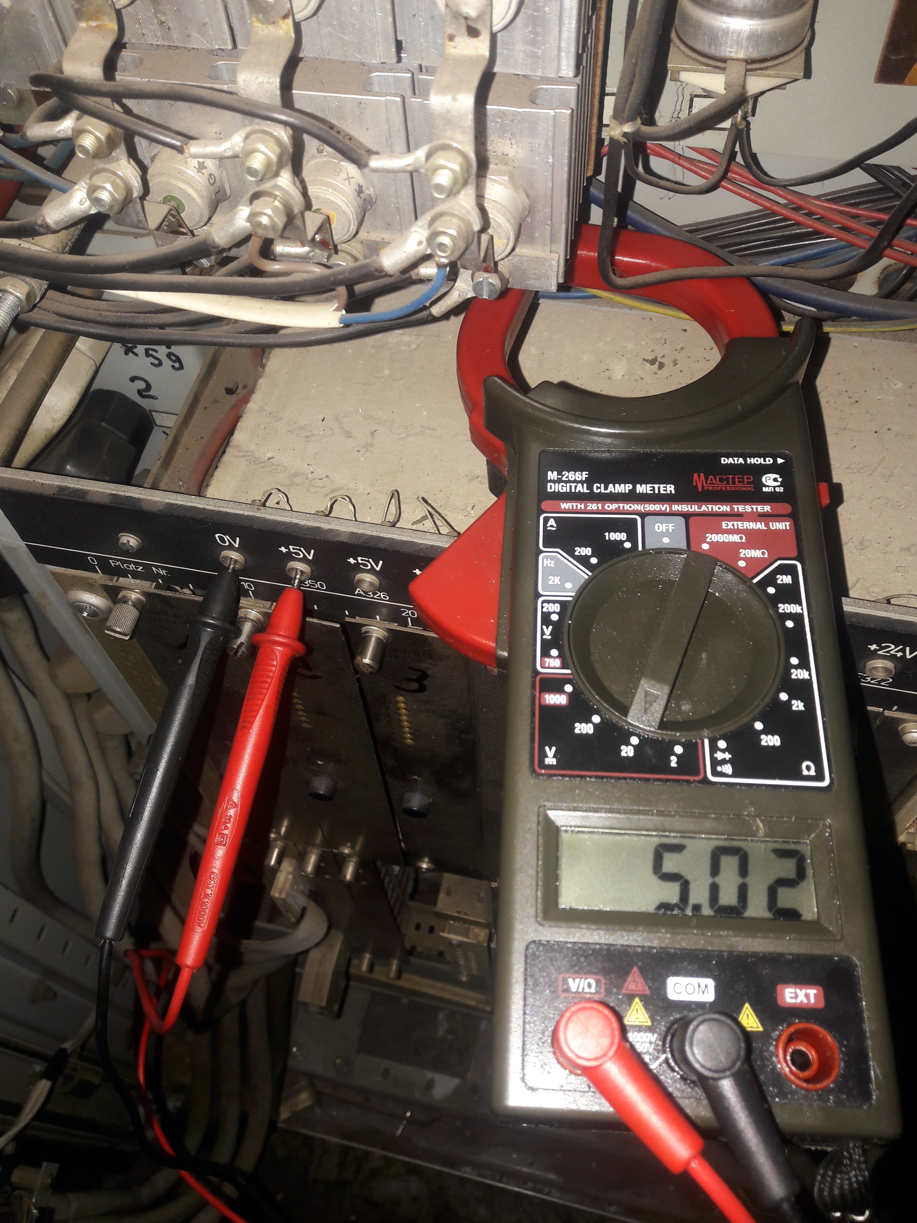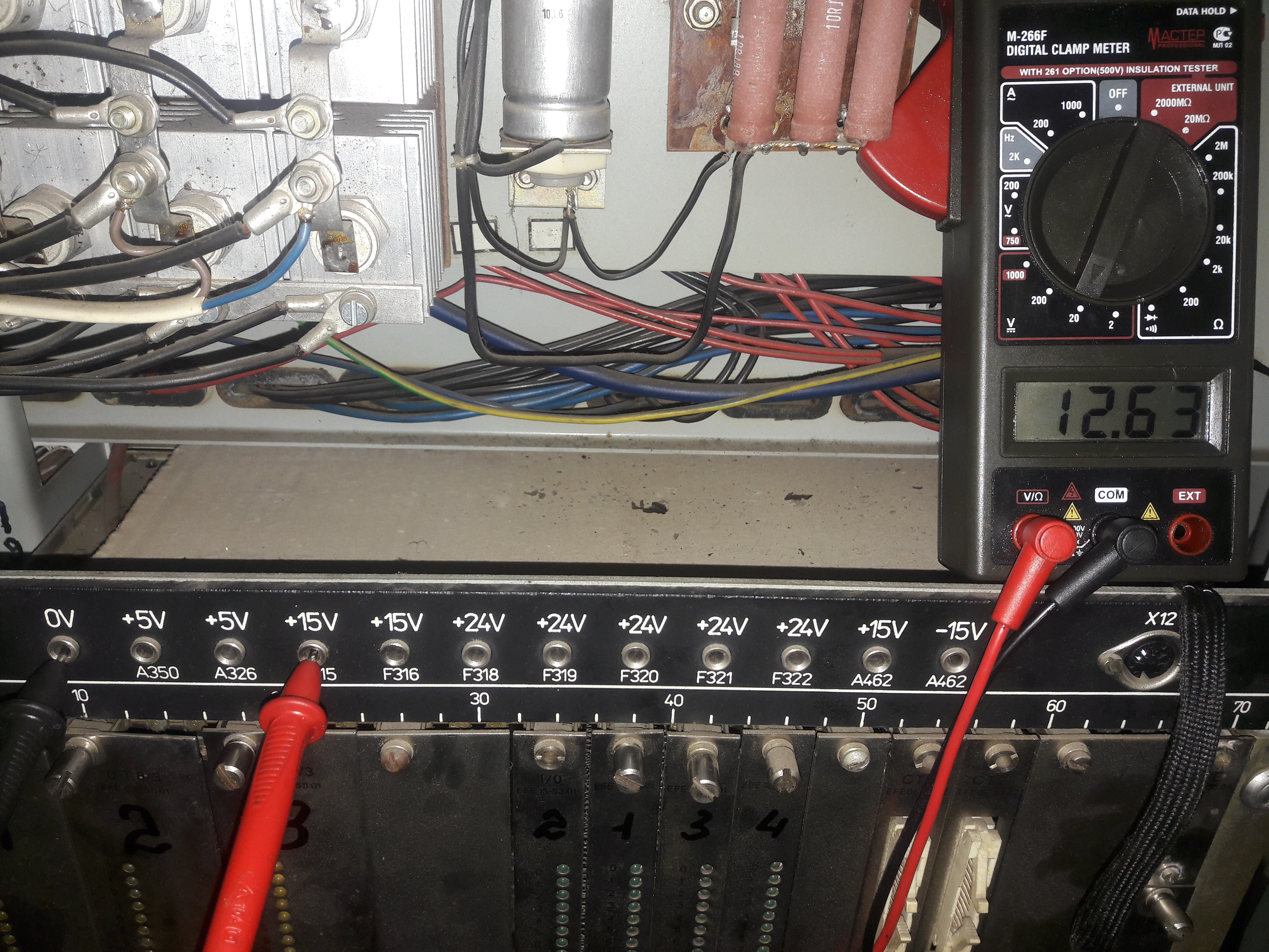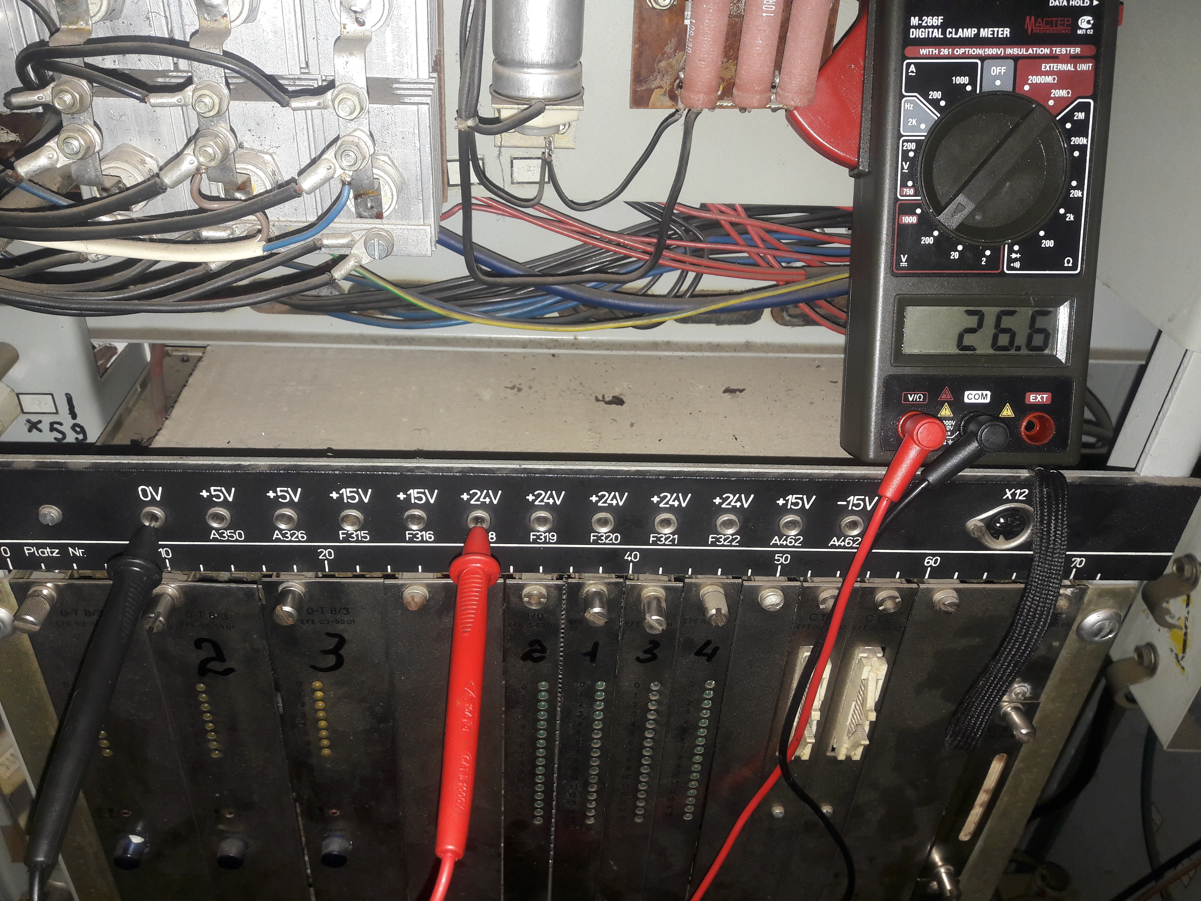 Ситуация такая: если я правильно понимаю то, при включении тпа в течении буквально секунды электроника делает опрос. На фото видно горят четыре символа похожие на букву А. Но они должны погаснуть по истечению буквально секунды (если все исправно) и загореться 0 и красный светодиод (указывающий на сбой, неисправность в работе). Но этого не происходит. Горят эти четыре символа и S4002. С наружи шкафа все, теперь внутри: не горит на плате ZVE светодиод Run. Напряжение 5V есть. Смущают показания на двух 15V. Предохранители целы. Менялся комплект плат I/0 все четыре и ZVE сама плата а плата с программой не менялась. Реакции ноль.