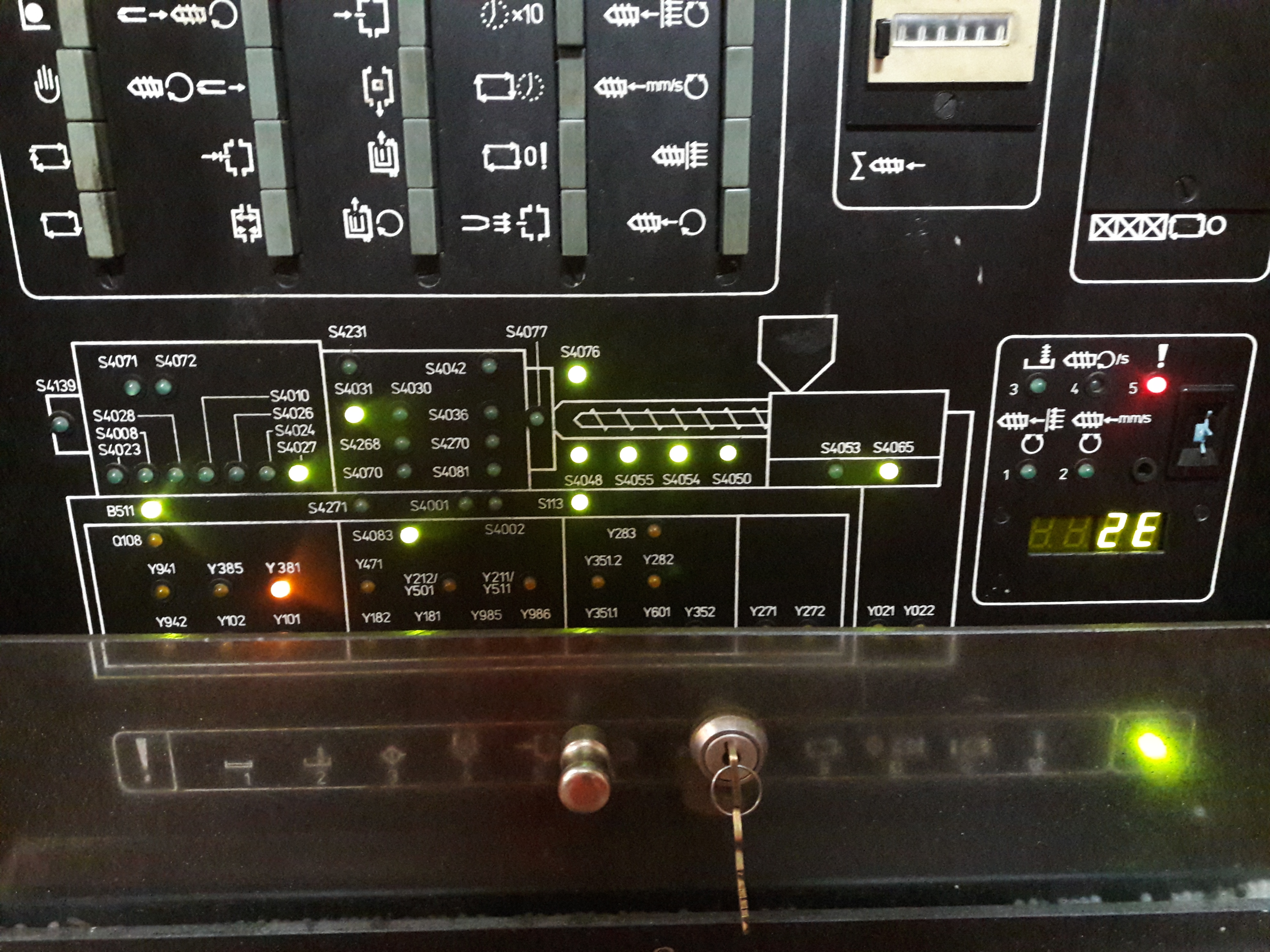 Загорается ошибка по температуре масла 2Е. Датчик (термометр сопротивления Р-100 вроде, два провода) при прозвонке показывает 110 Ом. Сколько должен показывать не знаю. Масло холодное. Только залито с бочки. Но горит 381. Магнит который расположен где повод воды к машине, на формы. Какую функцию выполняет не знаю.