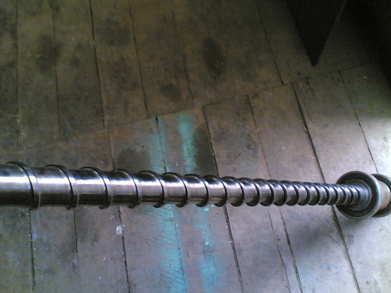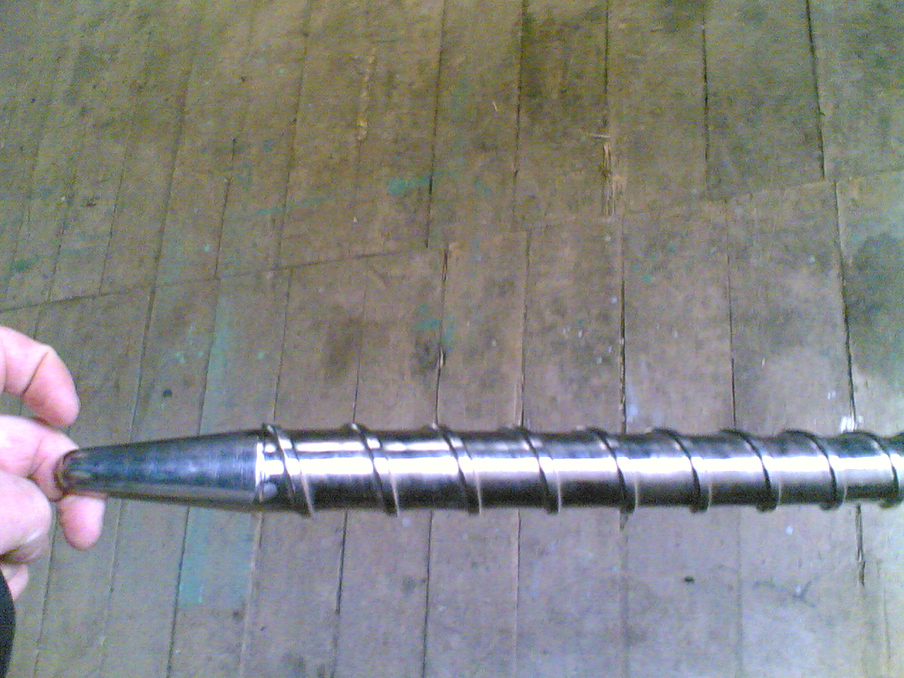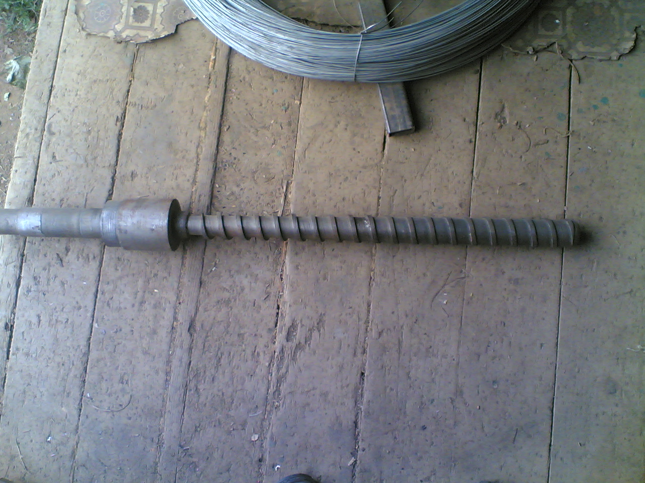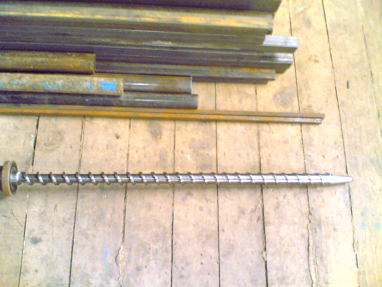 Спасибо ребята вам всем за отзывы. К сожалению пойти и найти на металлоломе старый экструдер это для нашей местности просто не возможно, нет рядом предприятий таких , а уезжать куда-то на поиски не додумался.Да, действительно, это было изобретение давно изобретенного велосипеда.Даже на покупку хлама, а он не дешево продавался около , я помню, 3000 долл, которых у меня не было.Поэтому был выбран этот путь.Работал над оборудованием по вечерам.Вот я пришел с мастерской где нашел свой старый шнек и сфотографировал его.Для его изготовления я брал мазовскую полуось ,она диаметром 44мм и длиной 1м, там сталь прекрасная , и отдавал кузнецу на отжиг, а затем с рисунком на бумаге шел к токарю и лепили шнек. ( что-то не вставляется фотка, подскажите как сделать, а то смотрю и не вижу заголовка-вставить вайл-.