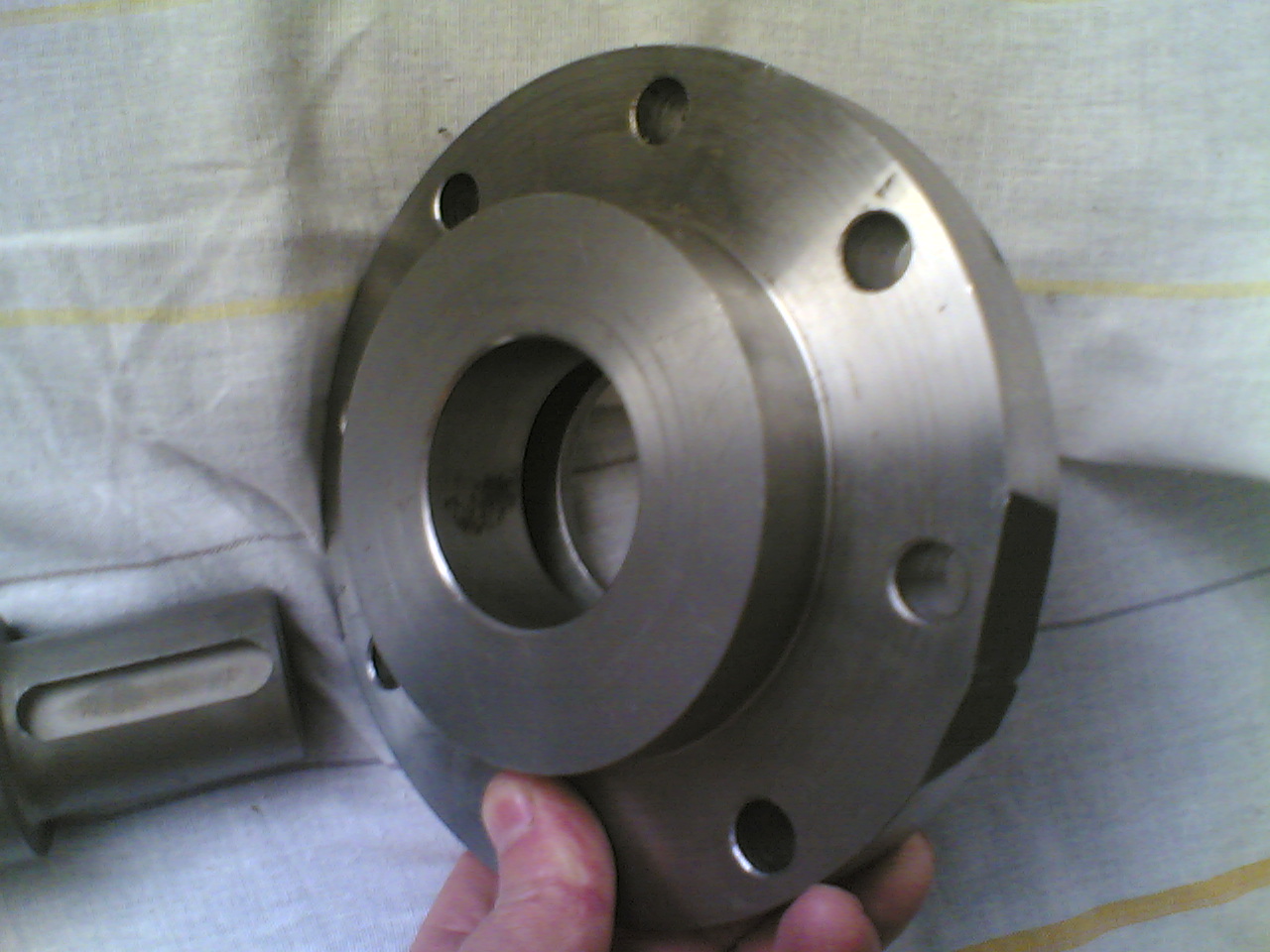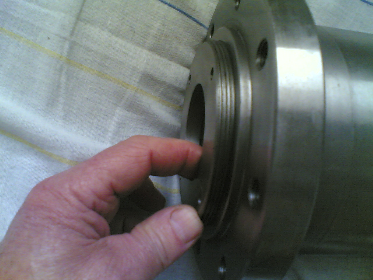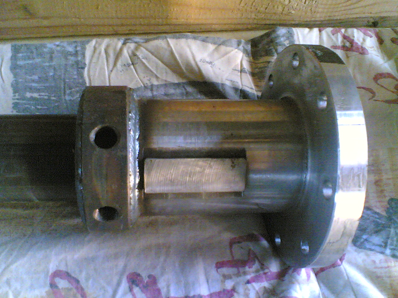 Дальше на снимке мы видим,справа от системы охлаждения, шпоночный паз, закрытый пробкой.Я до этого применял гужон(болт на 10мм), которым и старался предотвратить проварачивание трубы загрузочной горловины относительно цилиндра шнека; а когда-то это и случилось, когда сделал на шнеке функцию реверса.Теперь сделал шпоночный паз 50 на 14 и вставил шпонку ,а затем закрыл пробкой.Это более надежно, да и функцию Реверса я не ставлю в систему наладки частотника.Сама труба загр.горловины сделана под наружный диаметр 90мм и длиной 180мм ,включая и ширину фланца-20мм.Загрузочное окно сделал размером 50мм в длину и 40мм в ширину. Когда делал фрезеровщик это отверстие , то накуралесил мне немного.Я отлучился на 5мн и просил не начинать без меня фрезеровать, так он (грузин по нац.) погарячился, что я опоздал и начал фрезеровать ,не закрепив все это на шпонку и в результате немного попортил трубу. Сталь для загр. горловины пошла 45-я.Приступая к вытачиванию подшипникового вала для подшипникового узла , который служит для соединения шнека с редуктором через муфту, я решил сделать и охлаждение подшипников с помощью масла, которое будет нагнетаться с помощью масляного насоса.Подшипник спланировал 211 (качения) и упорный 8311. Предусмотрел и сальники-55-80-12. Для помощи циркуляции масла в корпусе подш.узла я на валу сделал (профрезеровал) перегородки , которые также ,при вращении вала ,будут способствовать циркуляции масла .Ну и просверлил отверстия для заливки масла и сапун. .Длина подшипникового вала 275мм.