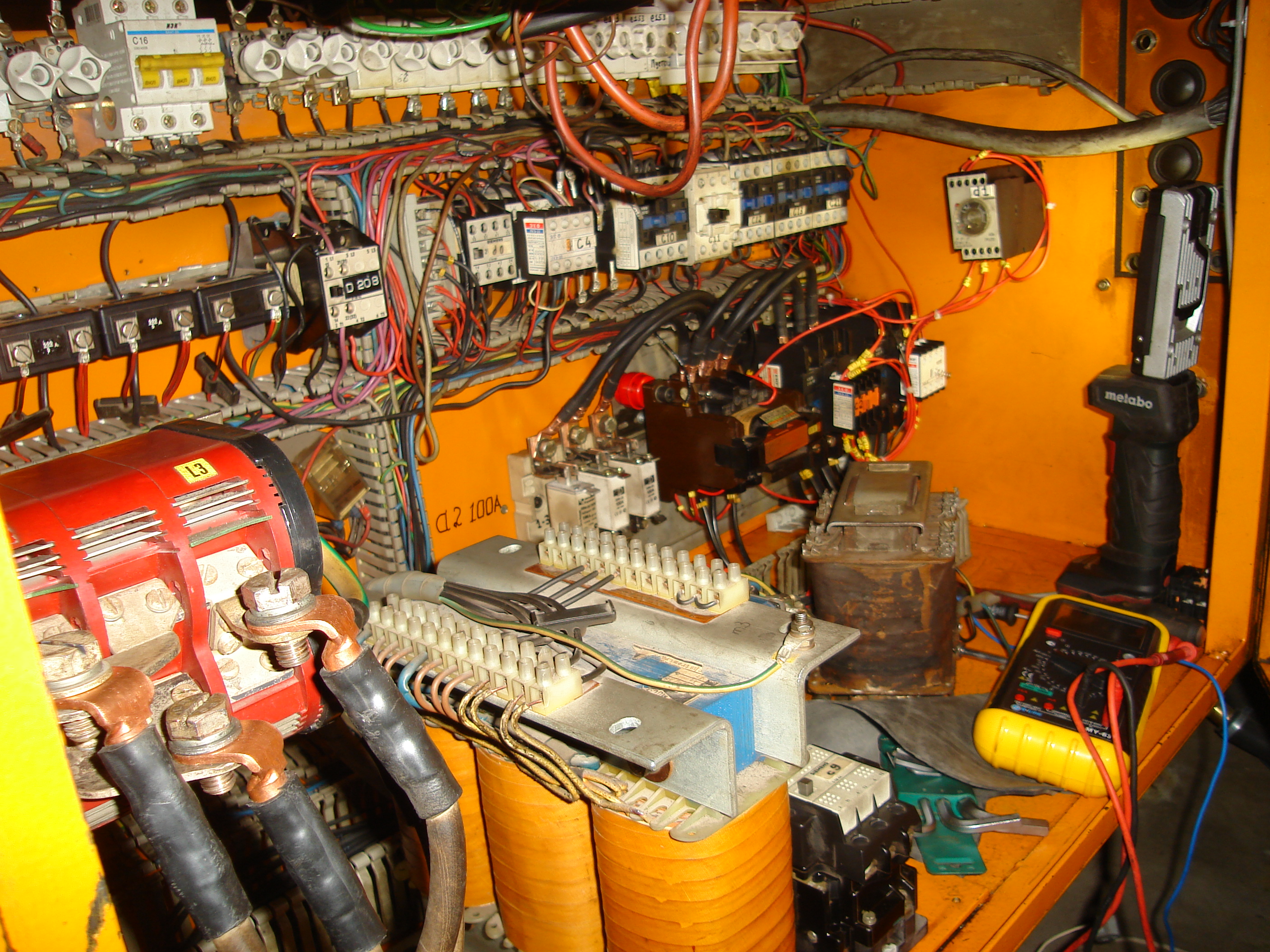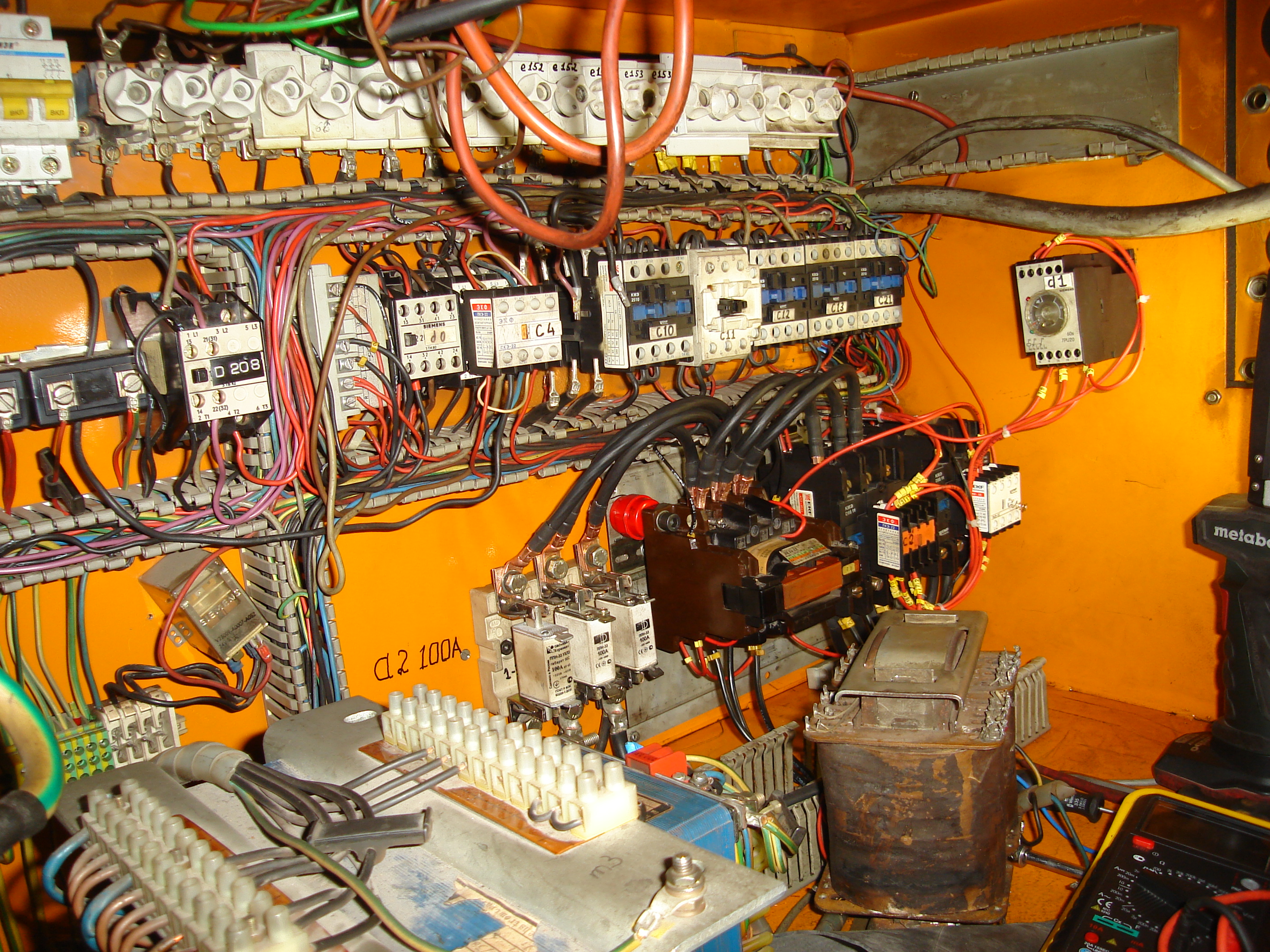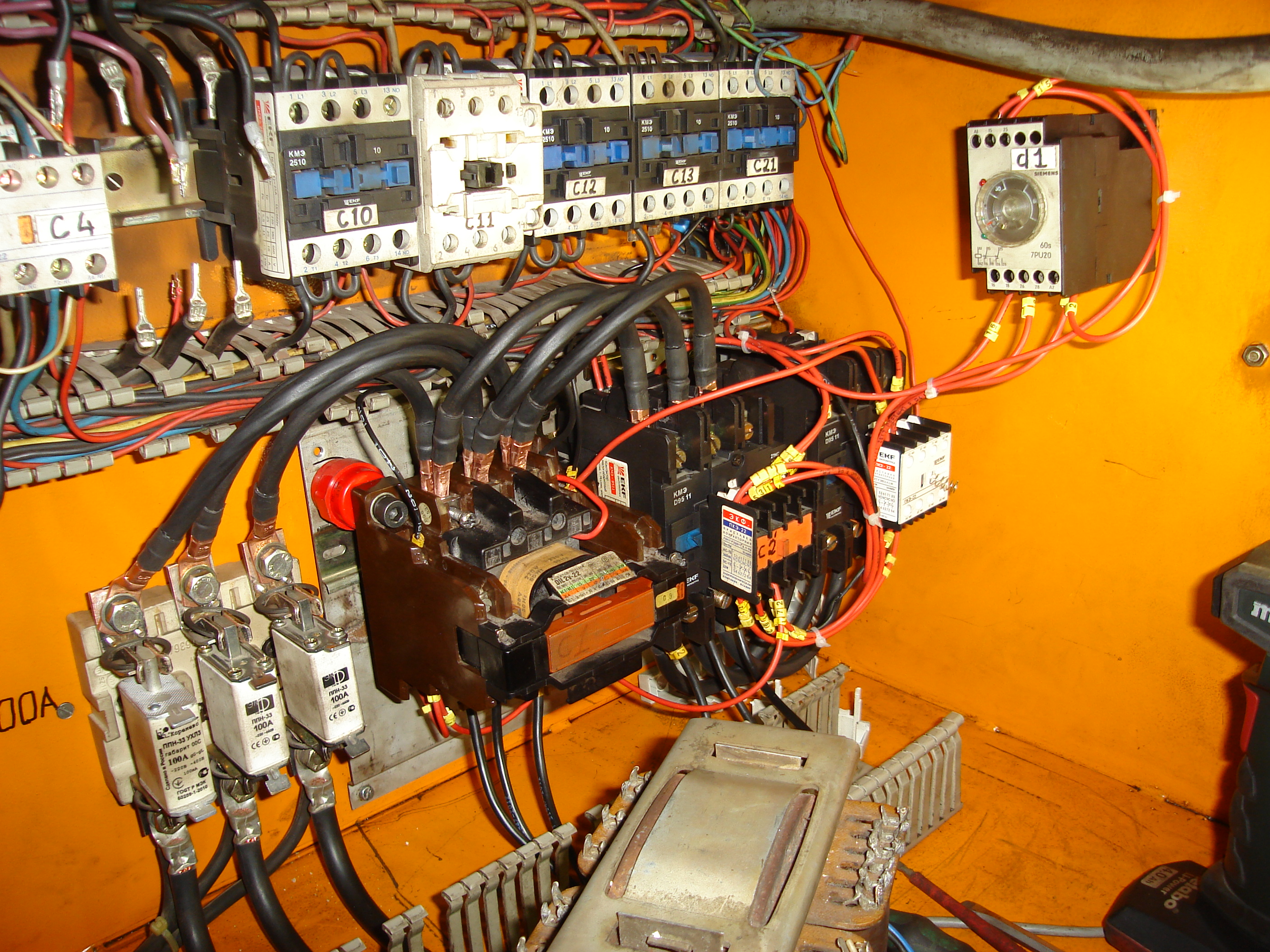 Я отследил все участи куда приходить напряжение при включении главного рубильника я не смог установить связь межу демонтированными частями (к ним приходить напряжение только после моего принудительного вкл.) А для работы электродвигателя с выходом на полную мощность требовалось нажать только кнопку пуск.