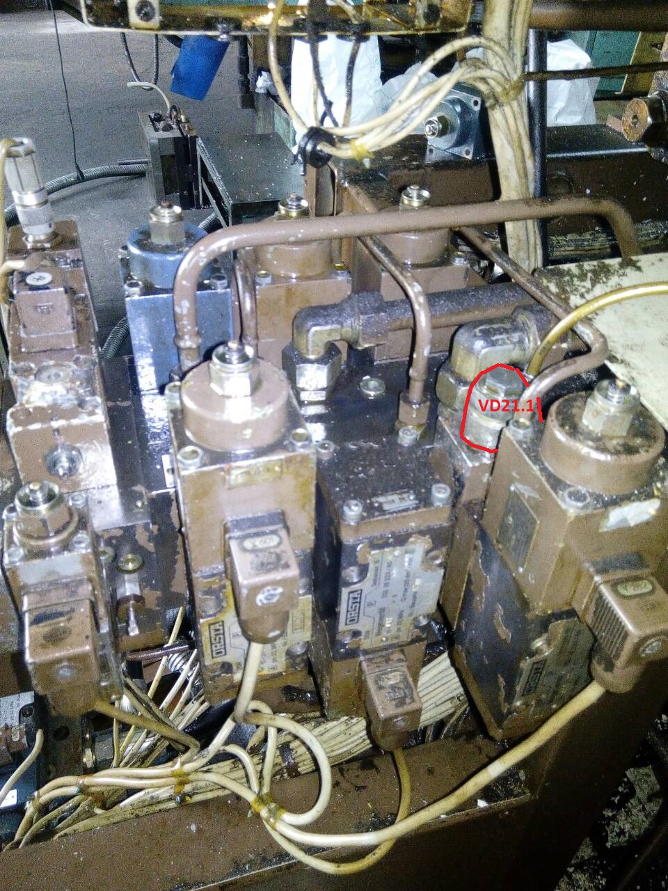 y21 и у22 включают производительность потоков насоса Р1 и Р2. заставляя насосы подавать масло в напорную линию. VD 21.1 ЭТО основной предохранительный клапан подпора патронного типа находится за электромагнитом У282. фишка читаема. Ввернут в блок вертикально голова под гаечный ключ. Он принимает на себя вытесняемое масло из цилиндра впрыска через у282. А линия управления работой VD 21.1 уходит через включеный распред у283 к пропорциональнику y807 А основное давление системы вынуждено встать на максимум настройки гидронасосов гидропривода.