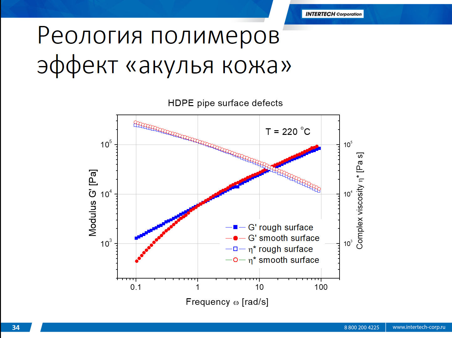 Не все согласны с этой идеей. Бытует мнение, что дефект связан с высоким модулем при низких скоростях сдвига. Соответственно, увеличиваем температуру - снижаем модуль, увеличиваем производительность (с учетом сохранения реальной температуры материала, а не фильеры)- увеличиваем скорость сдвига. В обоих случаях переходим в область отсутствия дефекта.Ник писал(а): 07 фев 2018, 20:36 ... А отсюда и ноги растут: основная причина так называемой "акульей шкуры" это тупая адгезия расплава полимера к металлическим частям экструзионной головки на выходе. Обычно в своей практике подымаю температуру на выходе из фильеры (не доходя температуры деструкции, хотя на ее в основном влияет время пребывания). Извините, если ошибаюсь!!!