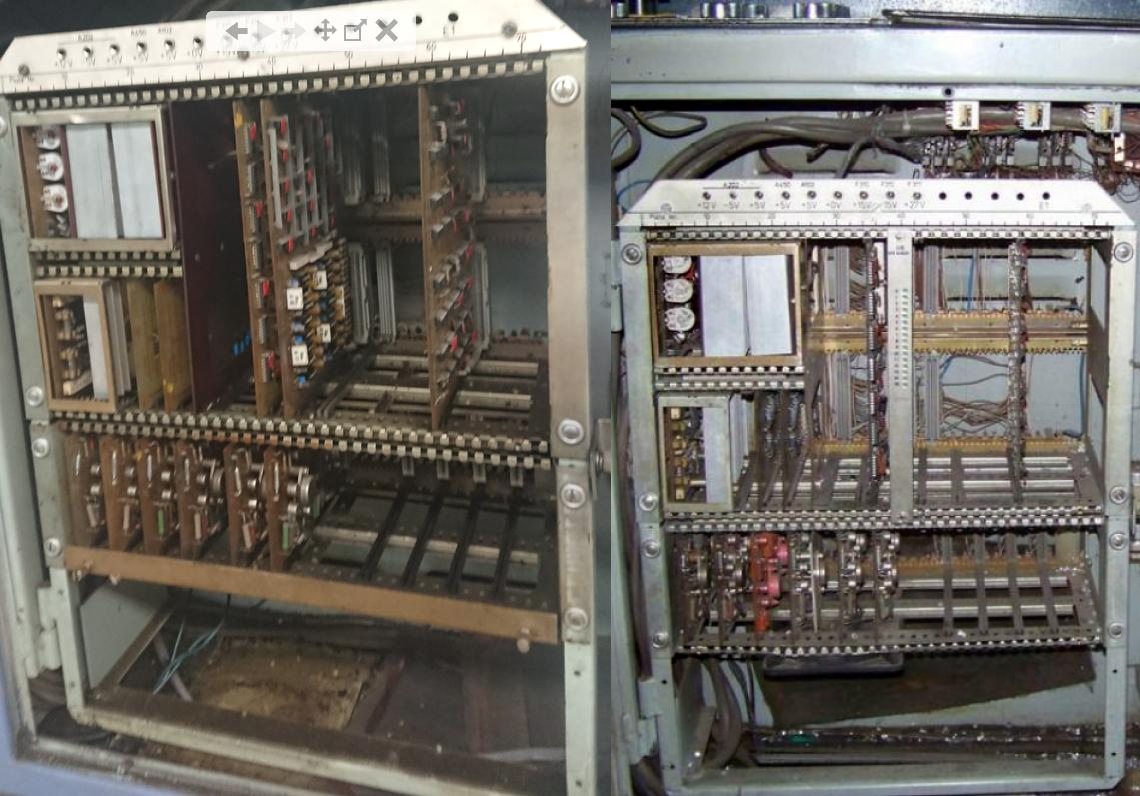 KuASY 170/55 1986год выпуска.Логический блок--самая нижняя часть вообще пустая , но она и вообще без разьемов.В средней части корзины(с левого угла 6 плат усилителей SAE 03-02.В верхней части корзины(справа на лево)платы SAE 06-051-L-00-01 далееSAE 15-51-01(со 110 оптронами),рядом слева SAE 20-51-L-00-01(с двумя ПЗУ типа наших 573 РФ2 хотя колодки 4 две из них пустые)И наконец в левом углу блок питания состоящий из двух половинок нижней и верхней. Нижняя половинка состоит из двух диодно-резисторных платок SAE 49-07 и блочка с двумя выходными транзисторами KU607 на морде блочка 2 предохранителя и 2 подстрочника,аббревиатура не совсем понятна RFT 52660?Верхняя половина блока питания выполнена в виде цельной кубической рамки с платой KSALH 01-01 ниже цифры 70155 на морде этой кубической рамки два радиатора и три подстрочника 100 ом.(Фото к сожалению пока выслать не могу по техническим причинам(Живём в каменном веке)