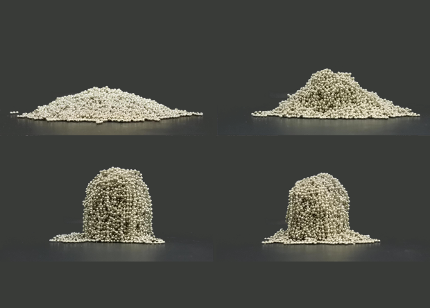 При этом форма структуры, которую из цилиндра после окончания эксперимента вытащили наружу, тоже очень сильно зависит от количества звеньев в цепочке. Если короткие цепочки, состоящие из двух или трех элементов, рассыпаются практически как песок, то при увеличении количества звеньев система стремится сохранить свою форму, немного рассыпаясь только по краям.Физики обнаружили, что если собрать в кучу большое количество шариковых цепочек, то по своим механическим свойствам эта куча будет очень похожа на полимерный материал. Как и для полимеров, для системы линейно связанных шариков характерен экспоненциальный рост силы трения от количества звеньев в цепи и от глубины проникновения измерительного зонда, пишут ученые в Physical Review Letters.