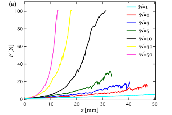 Во-первых, оказалось, что при погружении зонда внутрь массы цепочек действующая на него сила растет экспоненциально. То есть по мере увеличения глубины такая система становится все менее гибкой. Во-вторых, по аналогичном закону сила трения растет в зависимости от числа звеньев в цепи (эффект от увеличения глубины оказался аналогичен эффекту от роста квадрата количества шариков в цепочке). Кроме того, похожим экспоненциальным образом сила трения растет при увеличении плотности упаковки цепочек и, наоборот, падает при увеличении размера одного звена.