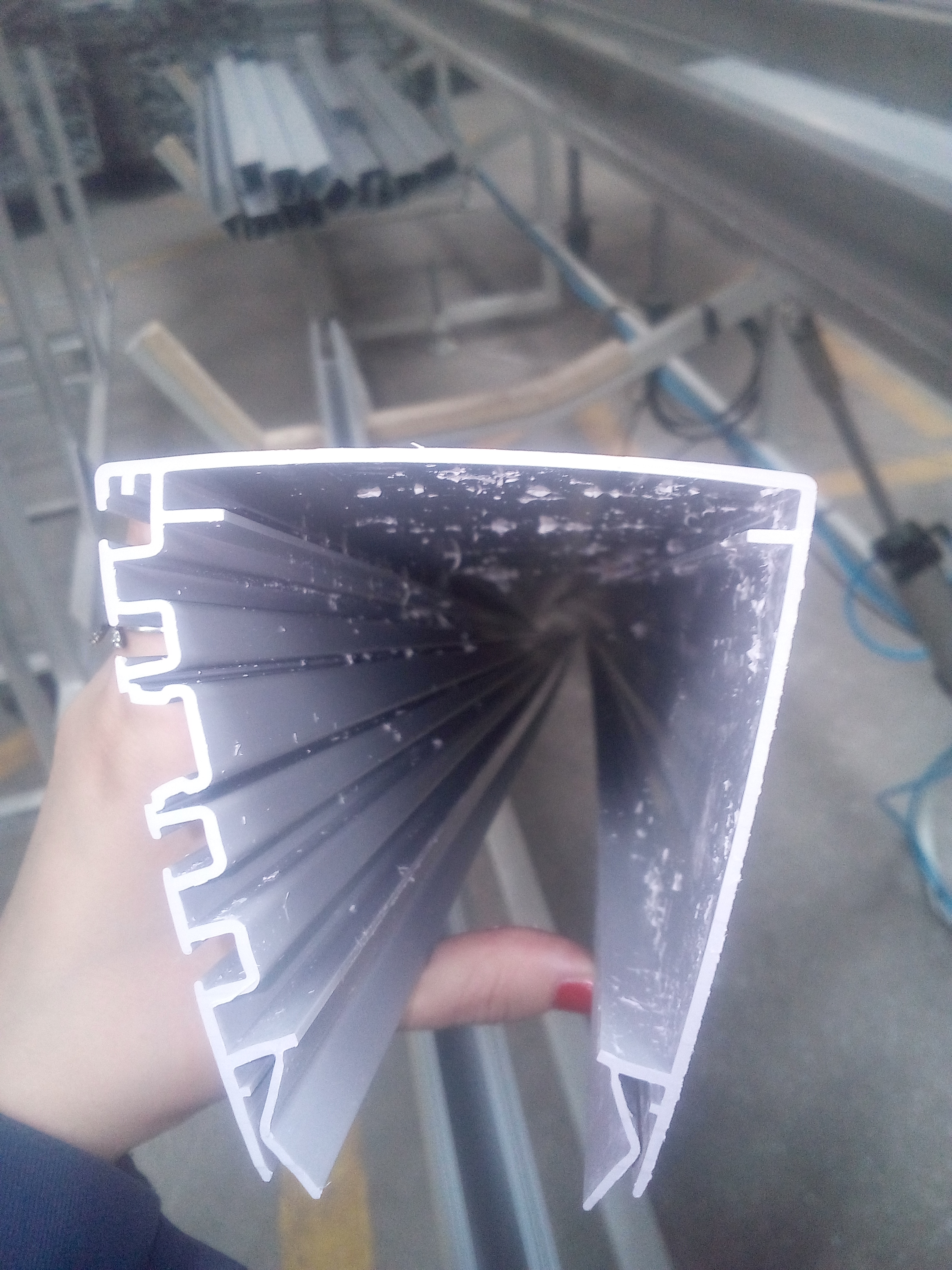 Прошу совета. Производим П-образный профиль из ПВХ. Профиль откалибровать должным образом не получается, профиль не держит форму (фото прилагается). Как можно исправить эту проблему? Может дополнительно нагреть после выхода из калибратора профиль?