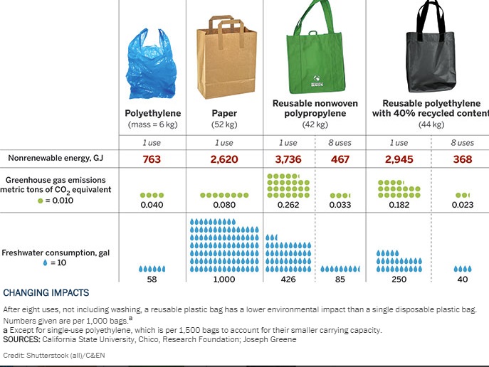 После 8 использований (без стирки) влияние на окружающую среду пластиковой сумки ниже, чем у одноразового пакета.