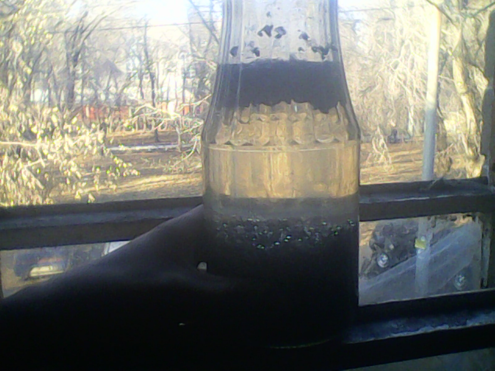А вот и бутылочка. Снимал уже тоже поздновато (на балалайке плохо вышло, да и пофиг), но насчёт внешнего вида и так представление выше дал. Тут конкретно пруфпик по составу фракций. Соотношение, лично по моим прикидкам, где-то в районе ~25-30% ПВД, ~70-75% ПВХ (то, что на фото ПВД меньше, объясняется маленьким размером резервуара - невсплывшим частичкам ПВД мешает всплыть толща частиц ПВХ и металла - в такой бутылке фракции особо не перемешаешь).