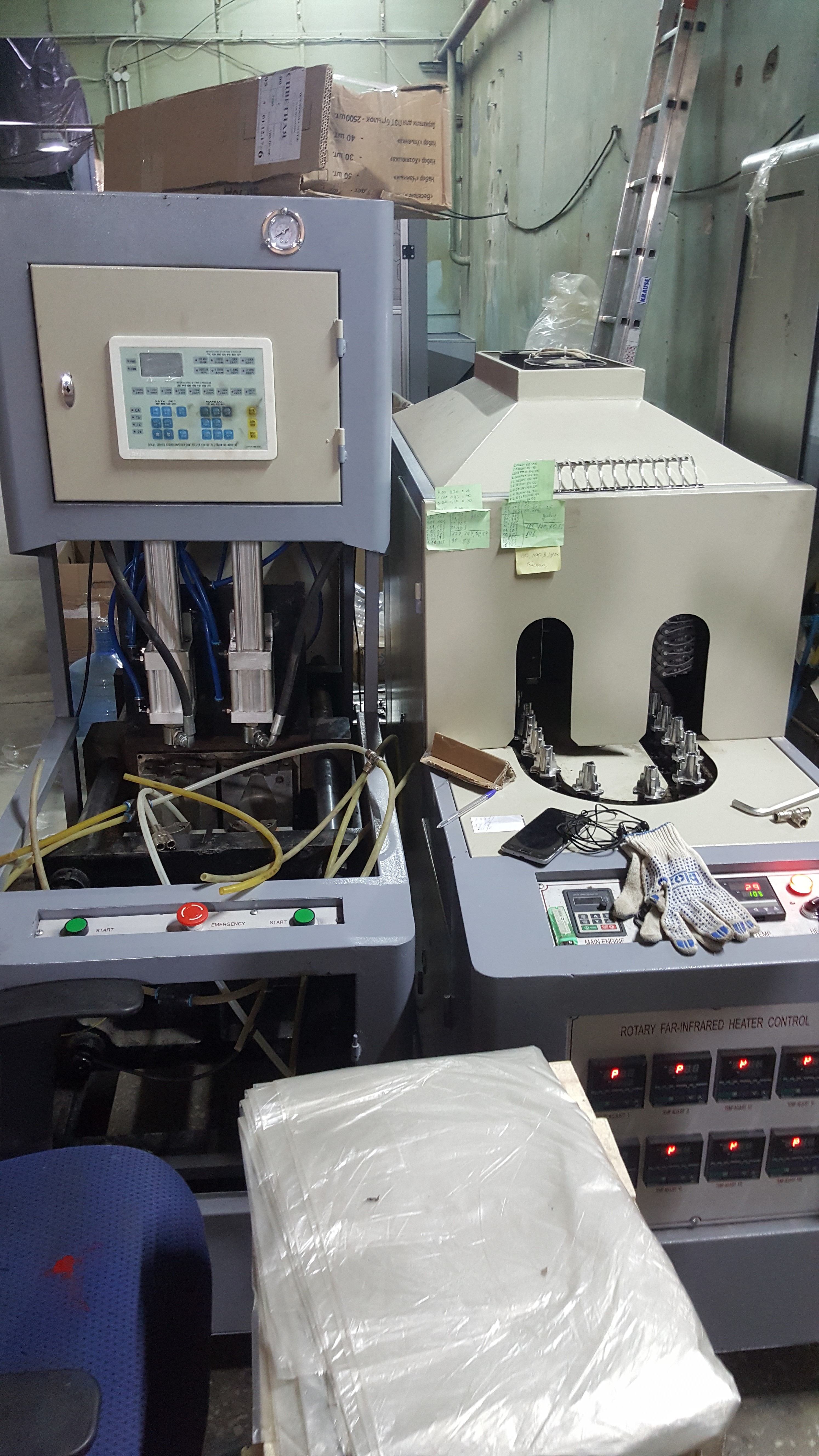 два станка по выдуву ПЭТ, как видно из фото разные, один якобы Сербский, второй Китай. Помощь нужна в определении вида, типа, производителя оборудования, а так же если найдутся руководства к ним, то не помешали бы и они.