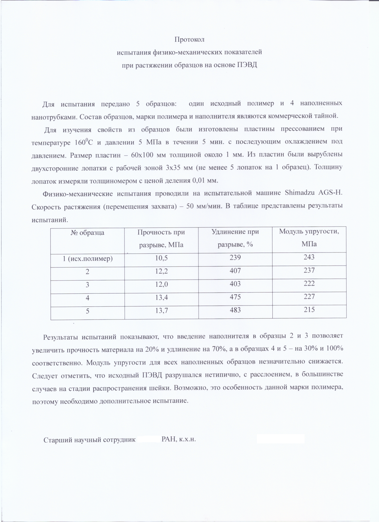 Сделали мастербатч с трубками, его ввели 1% в экструзионную ленту толщиной ~ мм 4. Из ленты в лаборатории отпрессовали лопатки, их порвали. Все цифры по прочности взяты из отчетов, протокол подгрузил.