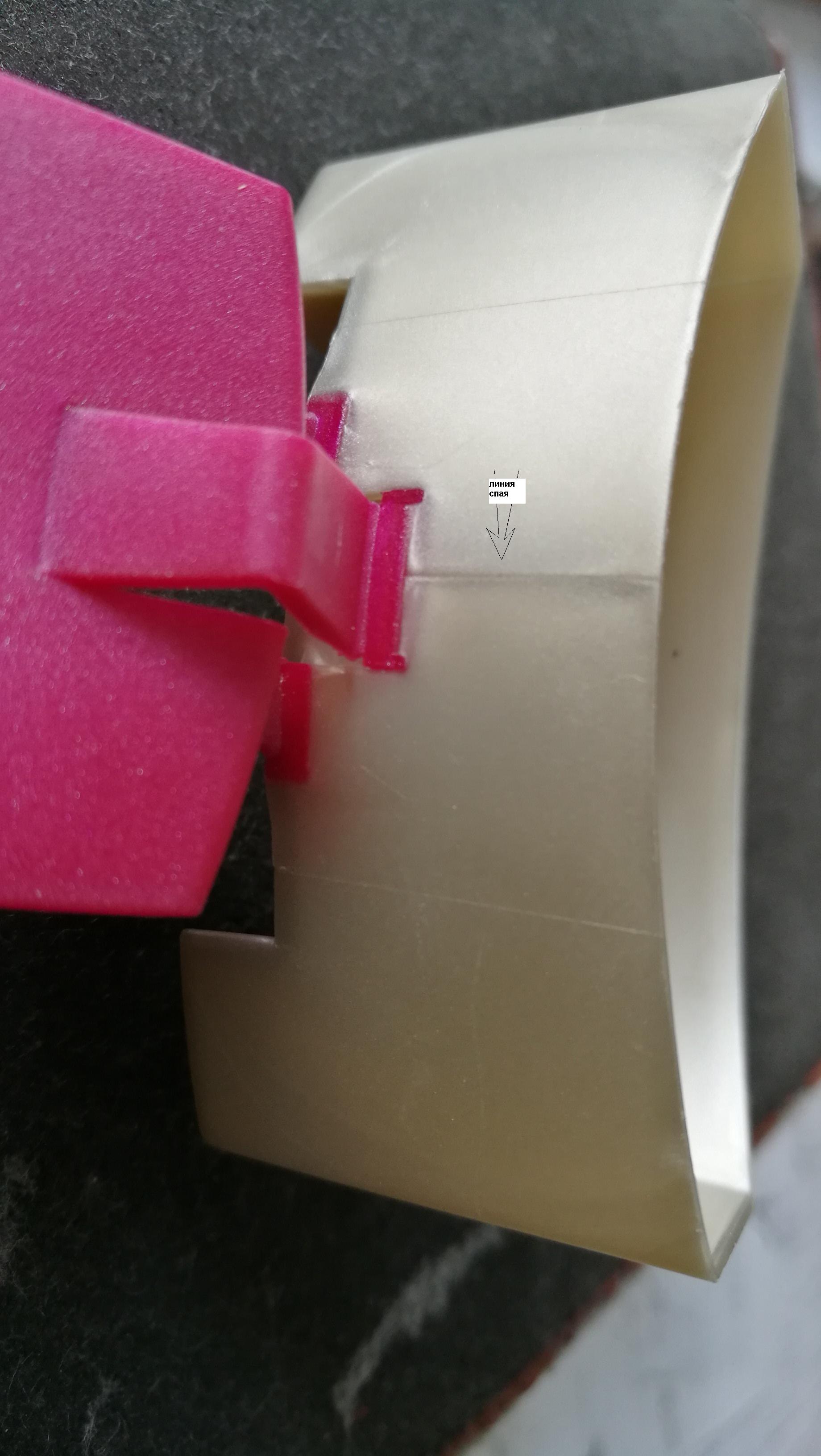 Называется данный дефект спаем и часто возникает на круглых деталях, когда материал при заполнении разделяется на два потока, которые потом встречаются на противоположной стороне от литника. То есть спай возникает всегда на таких деталях, но важно, чтобы температура двух встречающихся потоков не была слишком низкой. Оригинальная конфигурация вызвана тем, что встречаются помимо двух потоков по стенкам еще и третий поток со стороны дна. Вентиляция это только одно из средств для борьбы с этим дефектом. Можно рекомендовать увеличить скорость впрыска, повысить температуру формы, повысить температуру цилиндра, повысить давление выдержки.