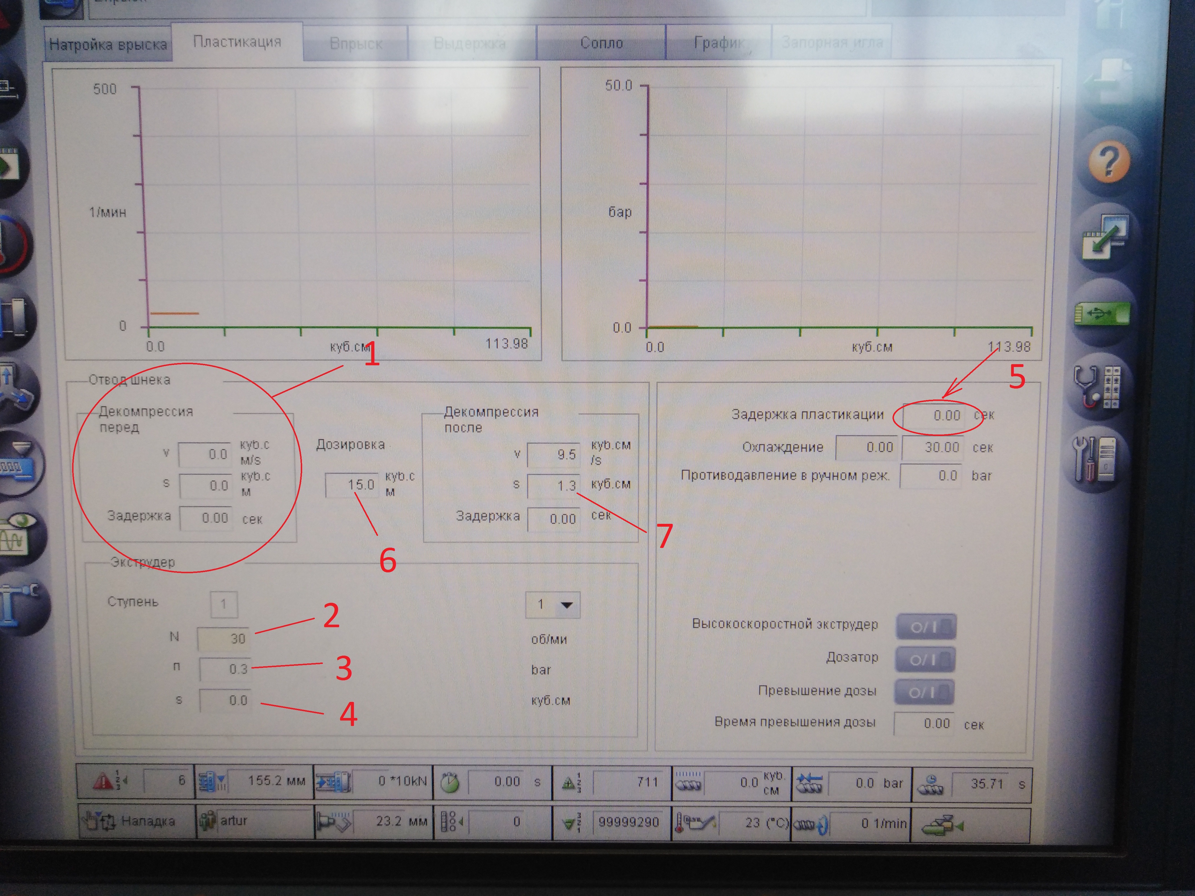 1. туда же 7 Декомпрессия перед началом набора под давлением. Впрыснули, дожали. Давление в каналах впрыска все равно осталось + нужно сдвинуть обратный клапан внутри шнека. Шнек двигается без вращения назад (от сопла) чтобы это давление разгрузить(что собственно и есть декомпрессия) со скоростью V на расстояние S ( 7 тоже самое) с задержкой 0.00 сек.