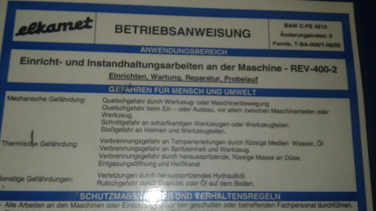 Инжекционно-выдувная литьевая машина PROCREA REV/400 400-2.Производитель Procrea S.r.l. (Италия) Via Leonardo da Vinci , n°12/14 . 24060 Carobbio degli Angeli. ( Bergamo ) - Italy. Telefono (++39) 035.951.307. Telefax (++39) 035.953.377