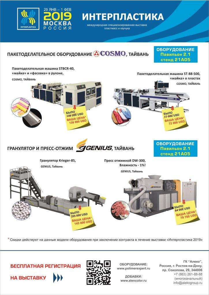 ГК «Алеко» по традиции примет участие в главной полимерной выставке страны – «Интерпластике». Мероприятие пройдет 29 января – 1 февраля 2019 года в Москве, «Экспоцентре» на Красной Пресне (м. Выставочная, Деловой Центр).
