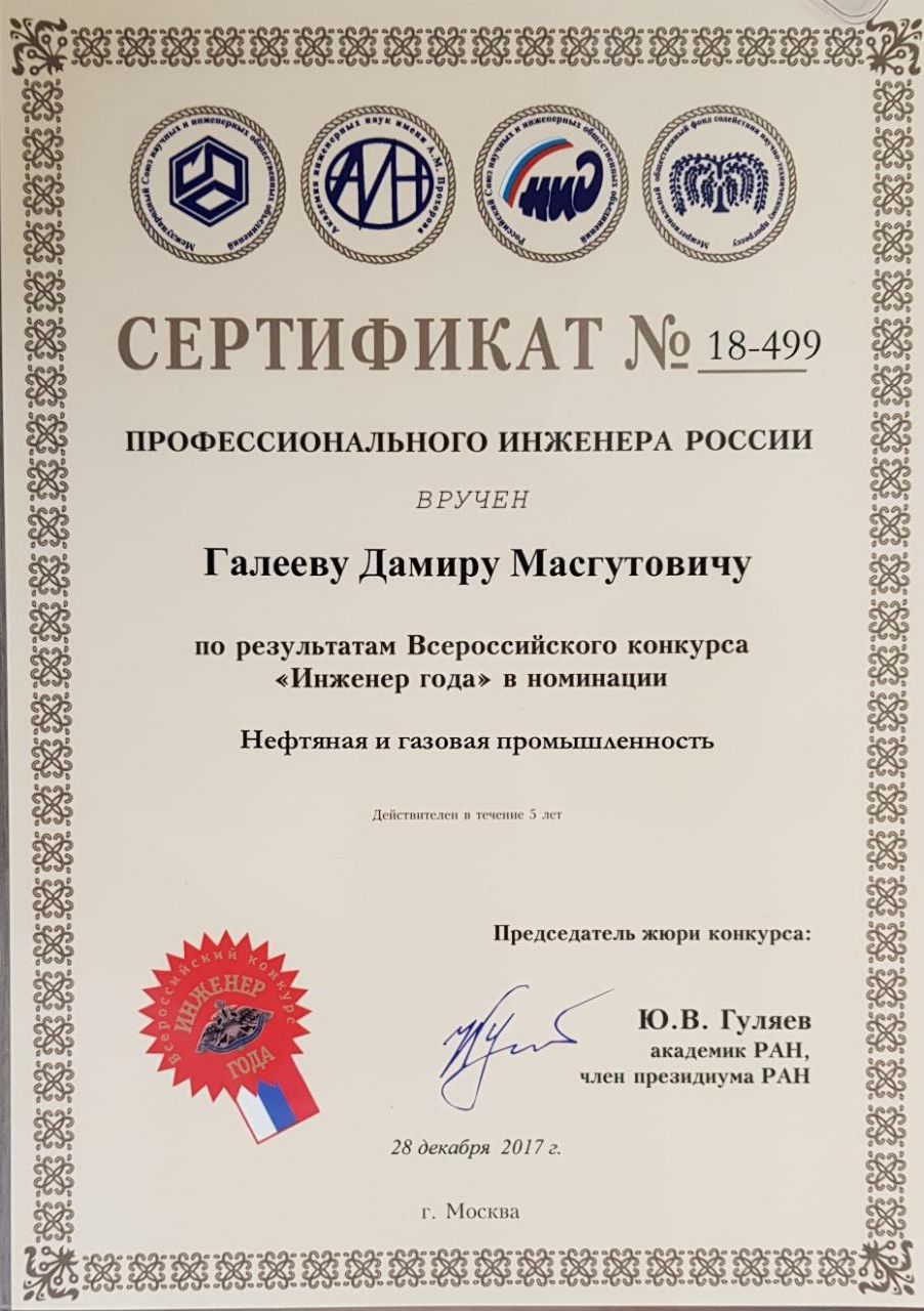 Дамиру Галееву присвоено звание "Профессионального инженера России" по результатам Всероссийского конкурса "Инженер года" в номинации "Нефтяная и газовая промышленность".