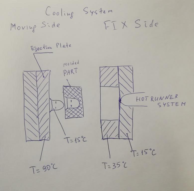 Как оказалось, материал очень сильно прилипает к хорошо отполированным поверхностям. Еще больше он прилипает при увеличении температур расплава и пресс-формы. У нас получается, что при низких температурах расплава (190-200С) расплав не может продавиться гидравликой ТПА ни на китайце, ни на немце (Демаге). Приходится поднимать хотя бы до 230-240 С. Температуру формы рекомендуют ставить 15 градусов С. Но при этом очень страшный внешний вид получается - с линиями течения расплава, граммпластинкой. И при этой температуре формы также не хочет стабильно изделие выниматься. Наши наладчики во главе с главным технологом уже накрутили схему, при которой подняли температуру подвижной части - на съемной плите, чтобы изделий хотя бы из неподвижной полуформы вынималось (см схему), но при этом приходится отдирать изделие от съемной плиты. И также не удалось добиться качества поверхности изделий и стабильности процесса - через несколько циклов, когда силикон заканчивается, изделия залипают в матрице неподвижной полуформы. Чтобы активизировать отлипание от матрицы, мы подвели сжатый воздух к ней и сдуваем при раскрытии пресс-формы. Правда эффекта почти не заметили. У DuPont/DOW есть процессинговые добавки для экструзии многослойных пленок, но они снижают прозрачность, а это уже ухудшение товарного вида.
