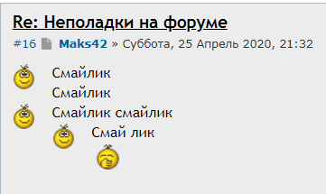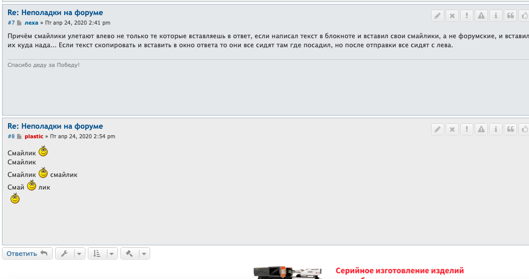 Причём смайлики улетают влево не только те которые вставляешь в ответ, если написал текст в блокноте и вставил свои смайлики, а не форумские, и вставил их куда нада... Если текст скопировать и вставить в окно ответа то они все сидят там где посадил, но после отправки все сидят с лева.