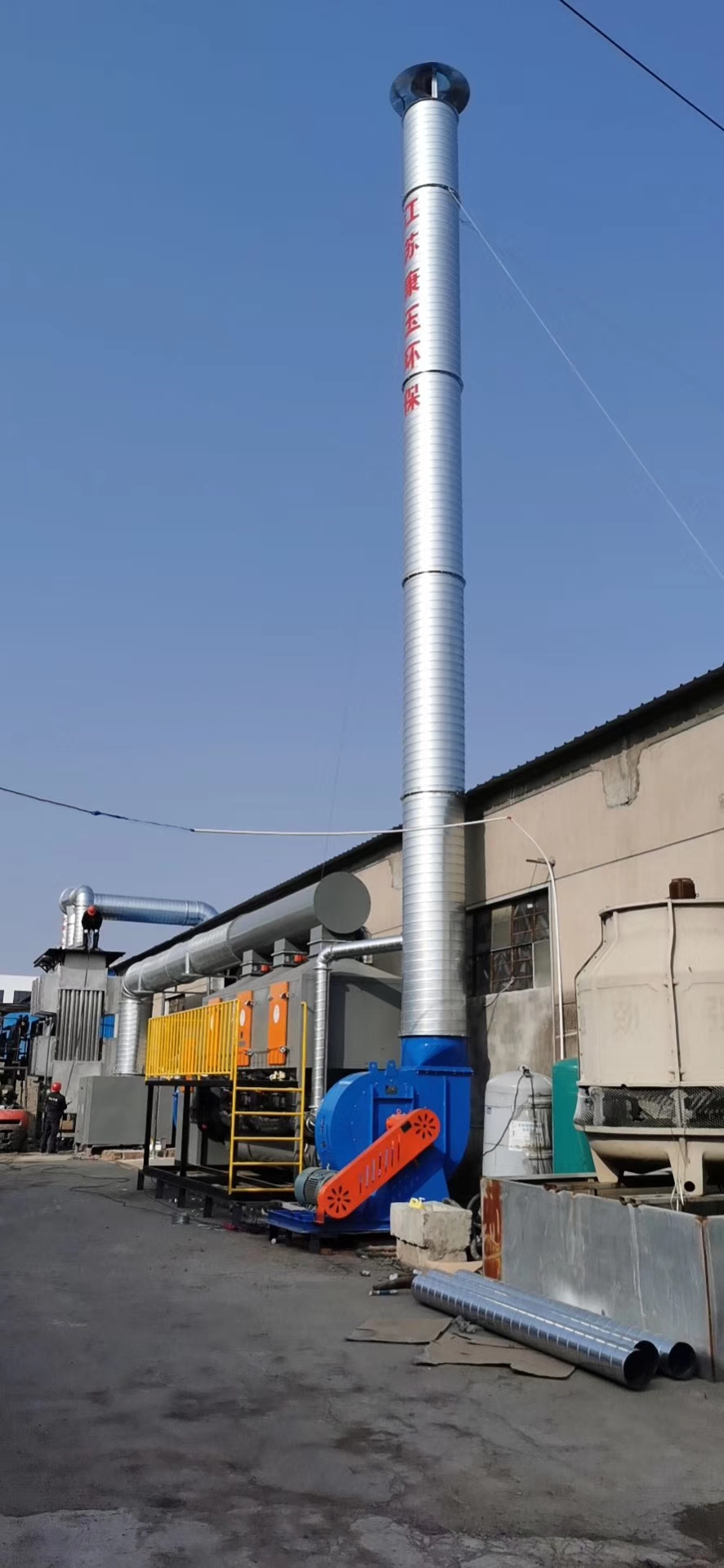 Процесс очистки: конденсатор(накопитель) + пневматическая вихревая башня + высоковольтное электростатическое устройство очистки дыма + высокоэффективный фильтровальный агрегат + адсорбция активированным углем и десорбированное каталитическое сжигание + вентилятор высотной вытяжки. Данная схема для цеха грануляции полиэфинов.