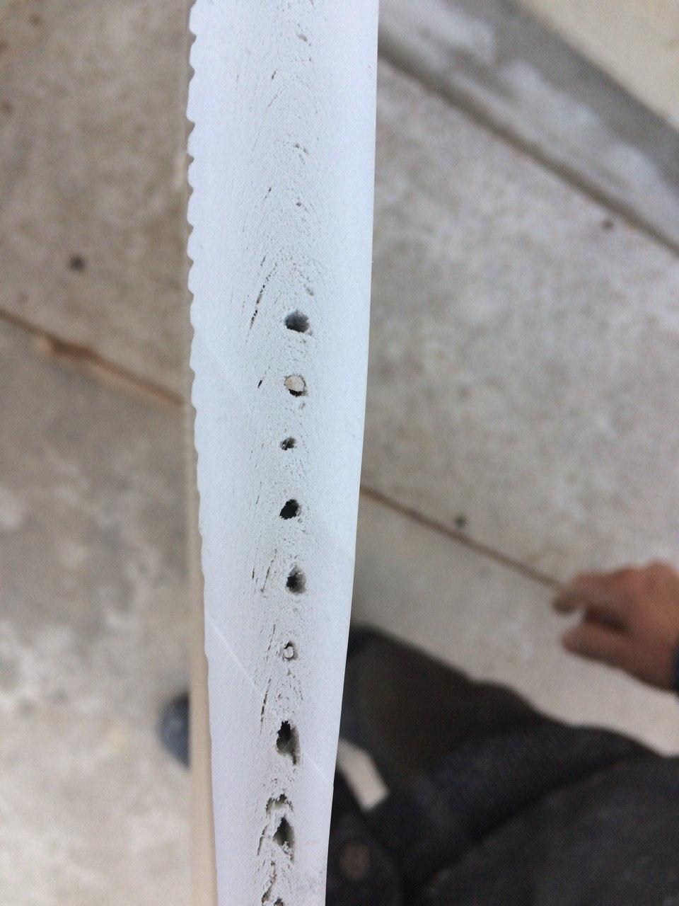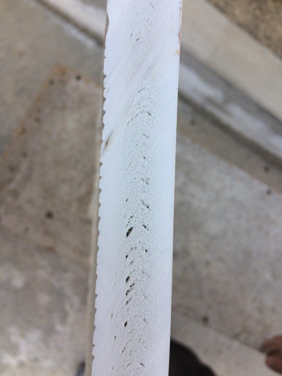 Вообще, напоминает ситуацию брошенного оператором экструдера с обрывом изделия и образованием "шляпы" или "гриба" между фильерой и калибром. При разрезе данного недоразумения видно, что материал внутри вспененный, жёлтый с образованием больших пустот. То есть внутреннее тепло сохраняется очень долго и происходит деструкция. По фото видно, что большие камеры в самом центре изделия, а ближе к краям поры всё меньше и меньше, хотя без желтизны..